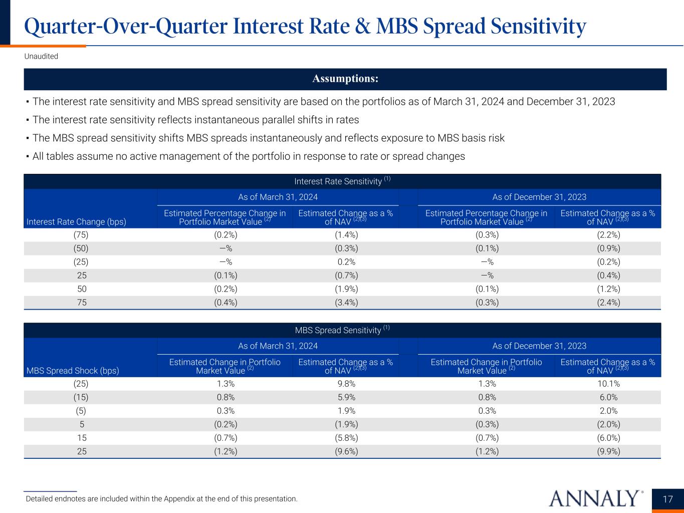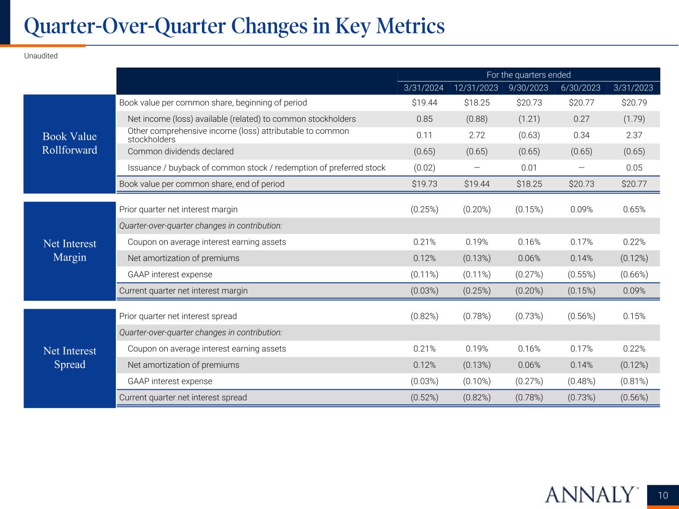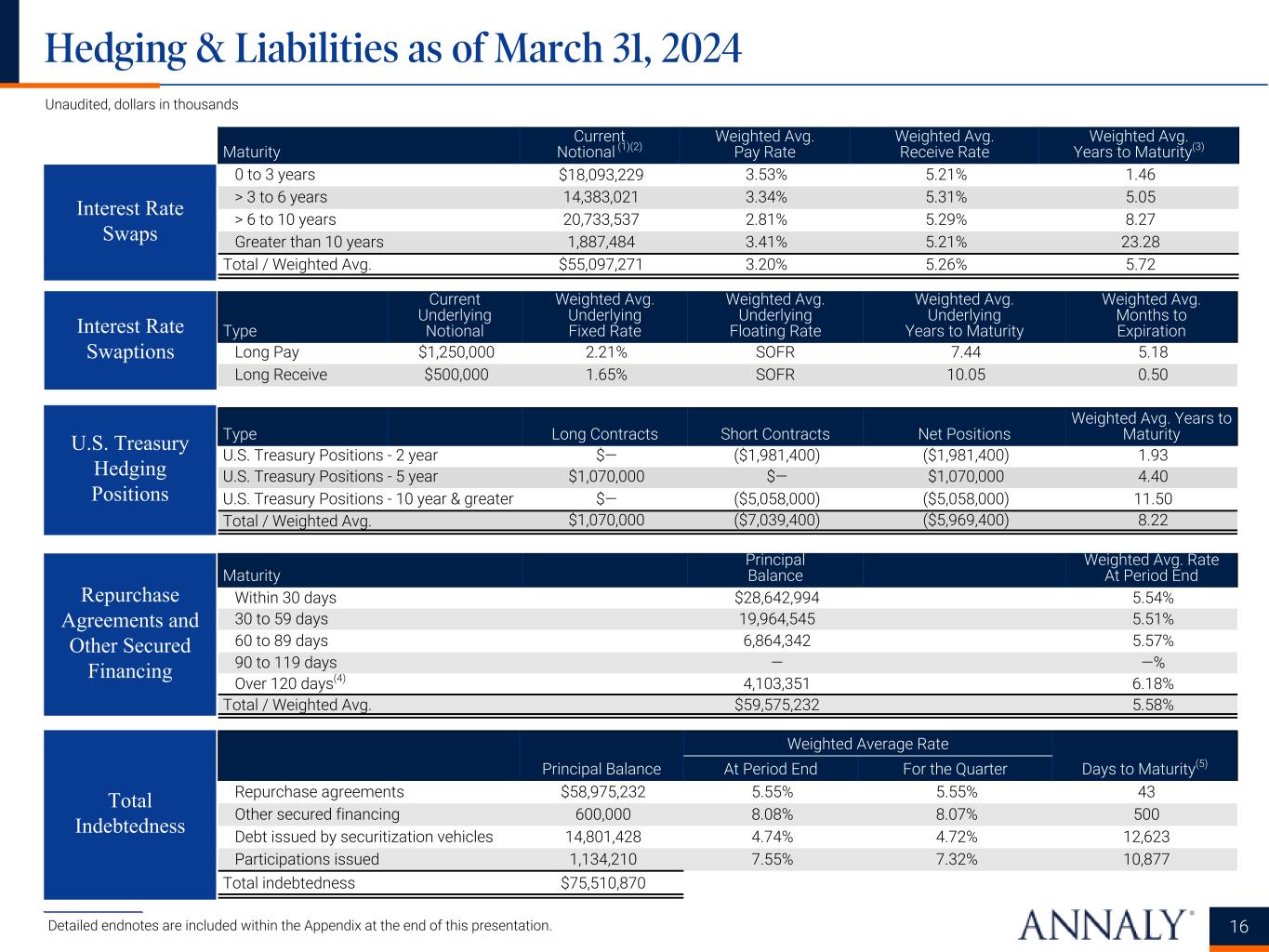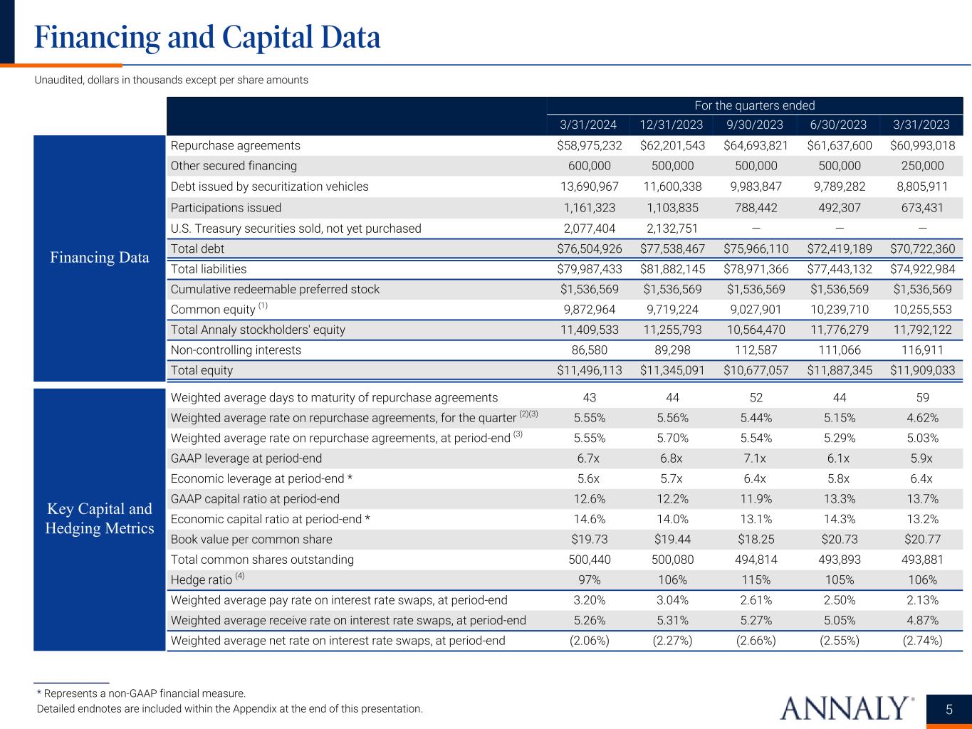 ___________________ * Represents a non-GAAP financial measure. Detailed endnotes are included within the Appendix at the end of this presentation. Financing and Capital Data For the quarters ended 3/31/2024 12/31/2023 9/30/2023 6/30/2023 3/31/2023 Repurchase agreements $58,975,232 $62,201,543 $64,693,821 $61,637,600 $60,993,018 Other secured financing 600,000 500,000 500,000 500,000 250,000 Debt issued by securitization vehicles 13,690,967 11,600,338 9,983,847 9,789,282 8,805,911 Participations issued 1,161,323 1,103,835 788,442 492,307 673,431 U.S. Treasury securities sold, not yet purchased 2,077,404 2,132,751 — — — Total debt $76,504,926 $77,538,467 $75,966,110 $72,419,189 $70,722,360 Total liabilities $79,987,433 $81,882,145 $78,971,366 $77,443,132 $74,922,984 Cumulative redeemable preferred stock $1,536,569 $1,536,569 $1,536,569 $1,536,569 $1,536,569 Common equity (1) 9,872,964 9,719,224 9,027,901 10,239,710 10,255,553 Total Annaly stockholders' equity 11,409,533 11,255,793 10,564,470 11,776,279 11,792,122 Non-controlling interests 86,580 89,298 112,587 111,066 116,911 Total equity $11,496,113 $11,345,091 $10,677,057 $11,887,345 $11,909,033 Weighted average days to maturity of repurchase agreements 43 44 52 44 59 Weighted average rate on repurchase agreements, for the quarter (2)(3) 5.55% 5.56% 5.44% 5.15% 4.62% Weighted average rate on repurchase agreements, at period-end (3) 5.55% 5.70% 5.54% 5.29% 5.03% GAAP leverage at period-end 6.7x 6.8x 7.1x 6.1x 5.9x Economic leverage at period-end * 5.6x 5.7x 6.4x 5.8x 6.4x GAAP capital ratio at period-end 12.6% 12.2% 11.9% 13.3% 13.7% Economic capital ratio at period-end * 14.6% 14.0% 13.1% 14.3% 13.2% Book value per common share $19.73 $19.44 $18.25 $20.73 $20.77 Total common shares outstanding 500,440 500,080 494,814 493,893 493,881 Hedge ratio (4) 97% 106% 115% 105% 106% Weighted average pay rate on interest rate swaps, at period-end 3.20% 3.04% 2.61% 2.50% 2.13% Weighted average receive rate on interest rate swaps, at period-end 5.26% 5.31% 5.27% 5.05% 4.87% Weighted average net rate on interest rate swaps, at period-end (2.06%) (2.27%) (2.66%) (2.55%) (2.74%) Unaudited, dollars in thousands except per share amounts Financing Data Key Capital and Hedging Metrics 5