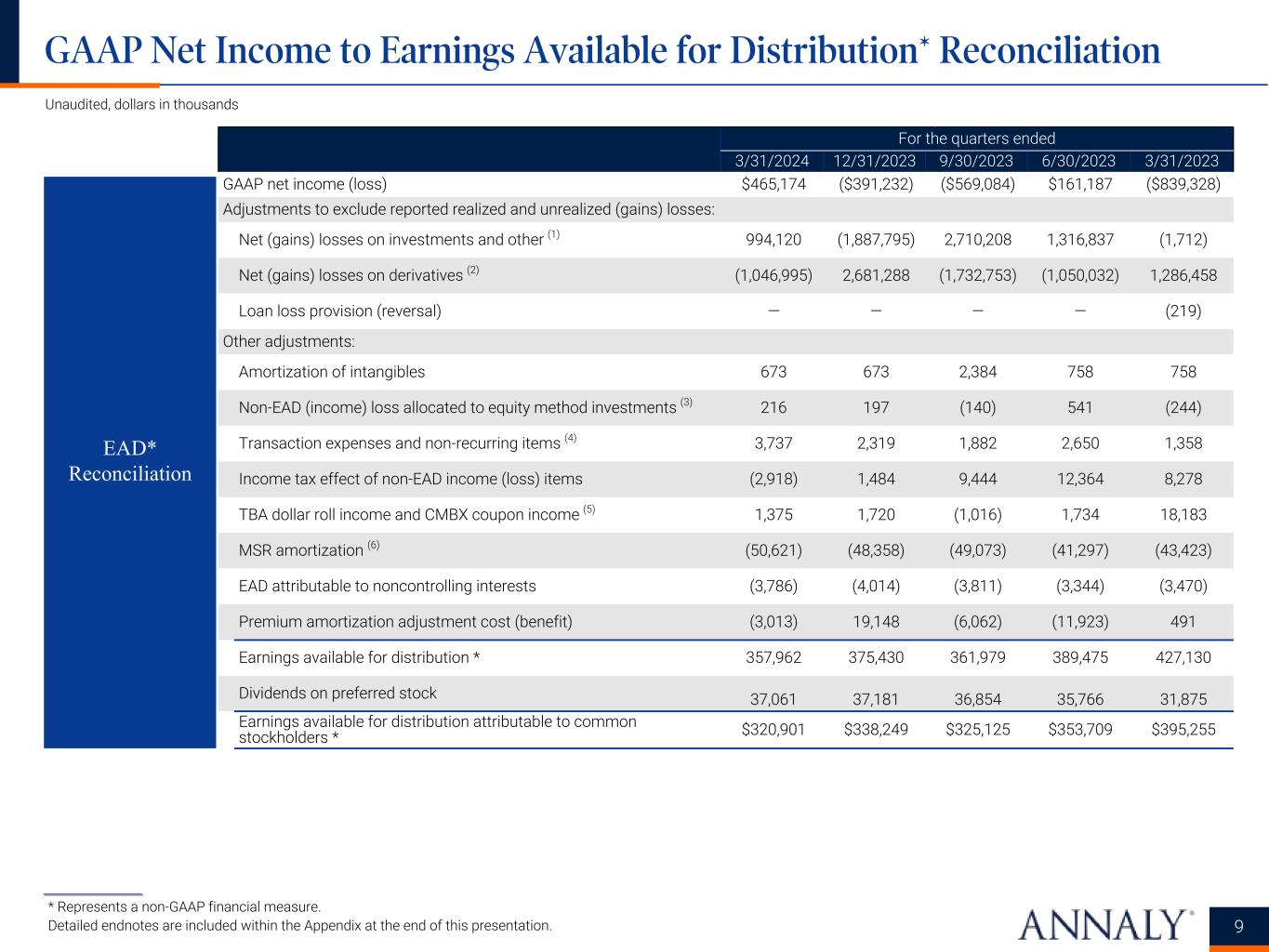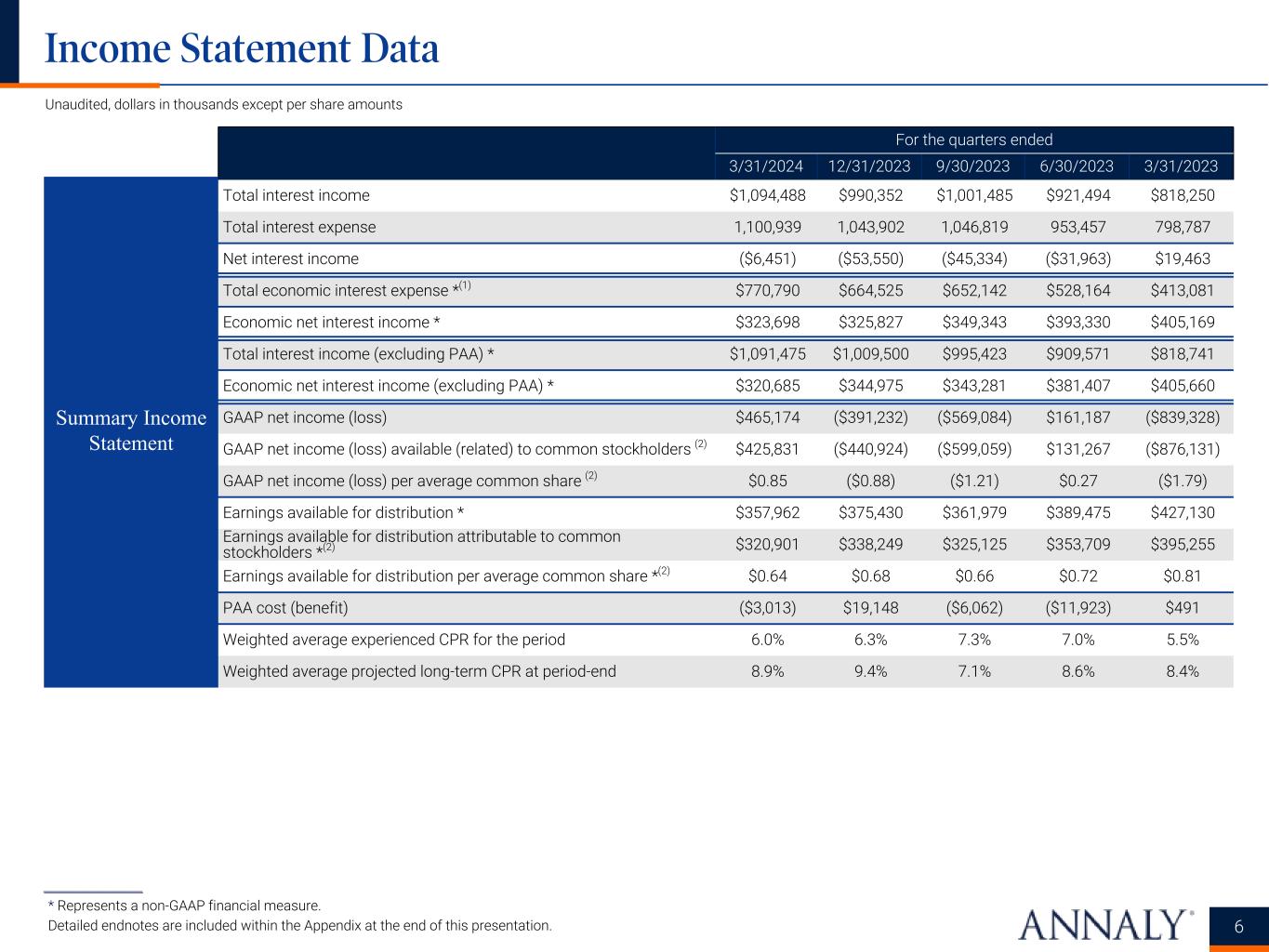 ___________________ * Represents a non-GAAP financial measure. Detailed endnotes are included within the Appendix at the end of this presentation. Unaudited, dollars in thousands except per share amounts For the quarters ended 3/31/2024 12/31/2023 9/30/2023 6/30/2023 3/31/2023 Total interest income $1,094,488 $990,352 $1,001,485 $921,494 $818,250 Total interest expense 1,100,939 1,043,902 1,046,819 953,457 798,787 Net interest income ($6,451) ($53,550) ($45,334) ($31,963) $19,463 Total economic interest expense *(1) $770,790 $664,525 $652,142 $528,164 $413,081 Economic net interest income * $323,698 $325,827 $349,343 $393,330 $405,169 Total interest income (excluding PAA) * $1,091,475 $1,009,500 $995,423 $909,571 $818,741 Economic net interest income (excluding PAA) * $320,685 $344,975 $343,281 $381,407 $405,660 GAAP net income (loss) $465,174 ($391,232) ($569,084) $161,187 ($839,328) GAAP net income (loss) available (related) to common stockholders (2) $425,831 ($440,924) ($599,059) $131,267 ($876,131) GAAP net income (loss) per average common share (2) $0.85 ($0.88) ($1.21) $0.27 ($1.79) Earnings available for distribution * $357,962 $375,430 $361,979 $389,475 $427,130 Earnings available for distribution attributable to common stockholders *(2) $320,901 $338,249 $325,125 $353,709 $395,255 Earnings available for distribution per average common share *(2) $0.64 $0.68 $0.66 $0.72 $0.81 PAA cost (benefit) ($3,013) $19,148 ($6,062) ($11,923) $491 Weighted average experienced CPR for the period 6.0% 6.3% 7.3% 7.0% 5.5% Weighted average projected long-term CPR at period-end 8.9% 9.4% 7.1% 8.6% 8.4% Income Statement Data Summary Income Statement 6