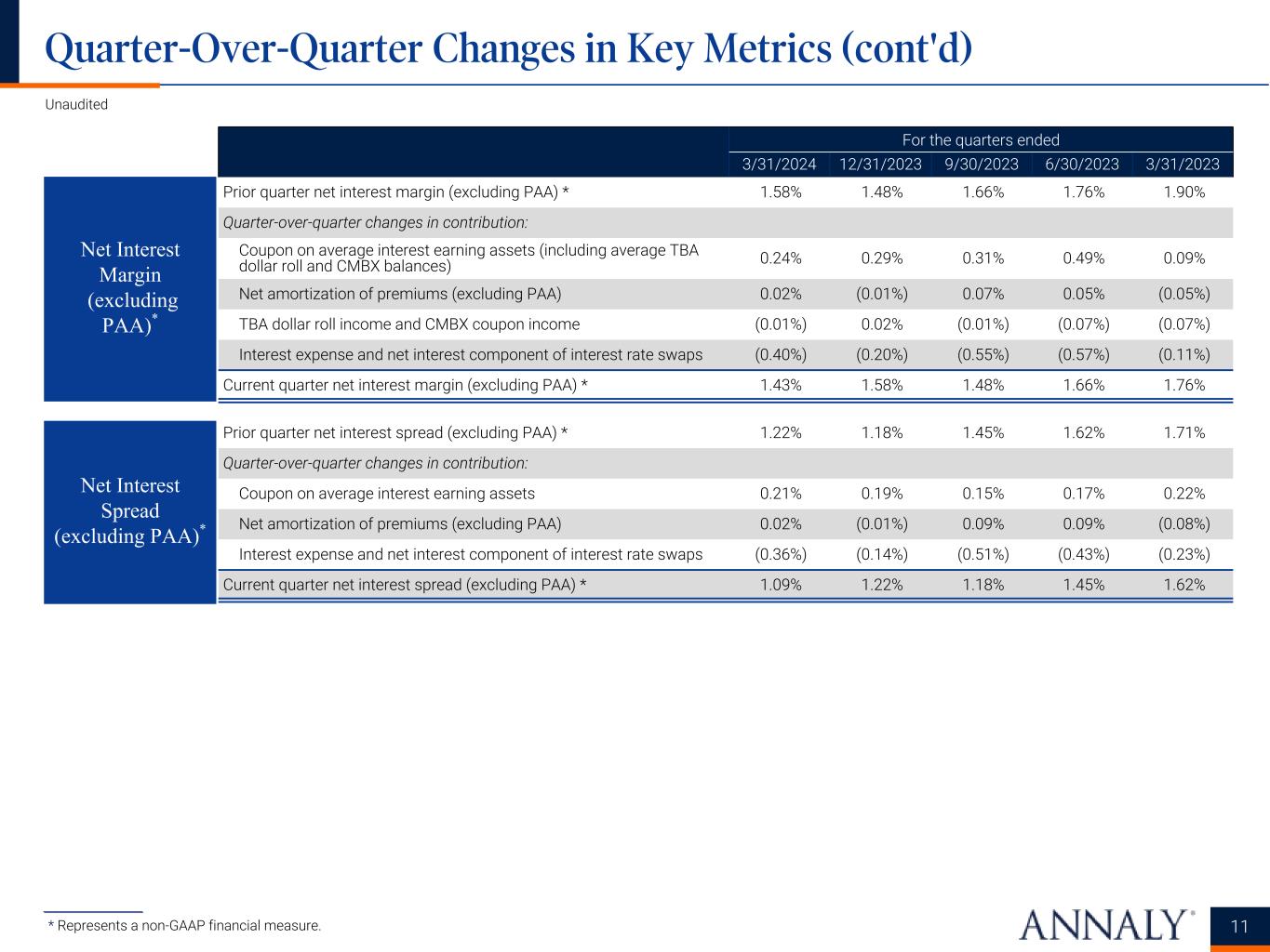 For the quarters ended 3/31/2024 12/31/2023 9/30/2023 6/30/2023 3/31/2023 Book value per common share, beginning of period $19.44 $18.25 $20.73 $20.77 $20.79 Net income (loss) available (related) to common stockholders 0.85 (0.88) (1.21) 0.27 (1.79) Other comprehensive income (loss) attributable to common stockholders 0.11 2.72 (0.63) 0.34 2.37 Common dividends declared (0.65) (0.65) (0.65) (0.65) (0.65) Issuance / buyback of common stock / redemption of preferred stock (0.02) — 0.01 — 0.05 Book value per common share, end of period $19.73 $19.44 $18.25 $20.73 $20.77 Prior quarter net interest margin (0.25%) (0.20%) (0.15%) 0.09% 0.65% Quarter-over-quarter changes in contribution: Coupon on average interest earning assets 0.21% 0.19% 0.16% 0.17% 0.22% Net amortization of premiums 0.12% (0.13%) 0.06% 0.14% (0.12%) GAAP interest expense (0.11%) (0.11%) (0.27%) (0.55%) (0.66%) Current quarter net interest margin (0.03%) (0.25%) (0.20%) (0.15%) 0.09% Prior quarter net interest spread (0.82%) (0.78%) (0.73%) (0.56%) 0.15% Quarter-over-quarter changes in contribution: Coupon on average interest earning assets 0.21% 0.19% 0.16% 0.17% 0.22% Net amortization of premiums 0.12% (0.13%) 0.06% 0.14% (0.12%) GAAP interest expense (0.03%) (0.10%) (0.27%) (0.48%) (0.81%) Current quarter net interest spread (0.52%) (0.82%) (0.78%) (0.73%) (0.56%) 10 Quarter-Over-Quarter Changes in Key Metrics Unaudited Book Value Rollforward Net Interest Margin Net Interest Spread