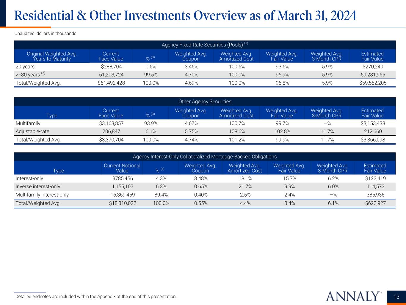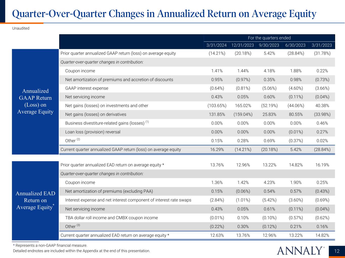 For the quarters ended 3/31/2024 12/31/2023 9/30/2023 6/30/2023 3/31/2023 Prior quarter annualized GAAP return (loss) on average equity (14.21%) (20.18%) 5.42% (28.84%) (31.78%) Quarter-over-quarter changes in contribution: Coupon income 1.41% 1.44% 4.18% 1.88% 0.22% Net amortization of premiums and accretion of discounts 0.95% (0.97%) 0.35% 0.98% (0.73%) GAAP interest expense (0.64%) (0.81%) (5.06%) (4.60%) (3.66%) Net servicing income 0.43% 0.05% 0.60% (0.11%) (0.04%) Net gains (losses) on investments and other (103.65%) 165.02% (52.19%) (44.06%) 40.38% Net gains (losses) on derivatives 131.85% (159.04%) 25.83% 80.55% (33.98%) Business divestiture-related gains (losses) (1) 0.00% 0.00% 0.00% 0.00% 0.46% Loan loss (provision) reversal 0.00% 0.00% 0.00% (0.01%) 0.27% Other (2) 0.15% 0.28% 0.69% (0.37%) 0.02% Current quarter annualized GAAP return (loss) on average equity 16.29% (14.21%) (20.18%) 5.42% (28.84%) Prior quarter annualized EAD return on average equity * 13.76% 12.96% 13.22% 14.82% 16.19% Quarter-over-quarter changes in contribution: Coupon income 1.36% 1.42% 4.23% 1.90% 0.25% Net amortization of premiums (excluding PAA) 0.15% (0.06%) 0.54% 0.57% (0.43%) Interest expense and net interest component of interest rate swaps (2.84%) (1.01%) (5.42%) (3.60%) (0.69%) Net servicing income 0.43% 0.05% 0.61% (0.11%) (0.04%) TBA dollar roll income and CMBX coupon income (0.01%) 0.10% (0.10%) (0.57%) (0.62%) Other (3) (0.22%) 0.30% (0.12%) 0.21% 0.16% Current quarter annualized EAD return on average equity * 12.63% 13.76% 12.96% 13.22% 14.82% 12 Unaudited Quarter-Over-Quarter Changes in Annualized Return on Average Equity ___________________ * Represents a non-GAAP financial measure. Detailed endnotes are included within the Appendix at the end of this presentation. Annualized GAAP Return (Loss) on Average Equity Annualized EAD Return on Average Equity*