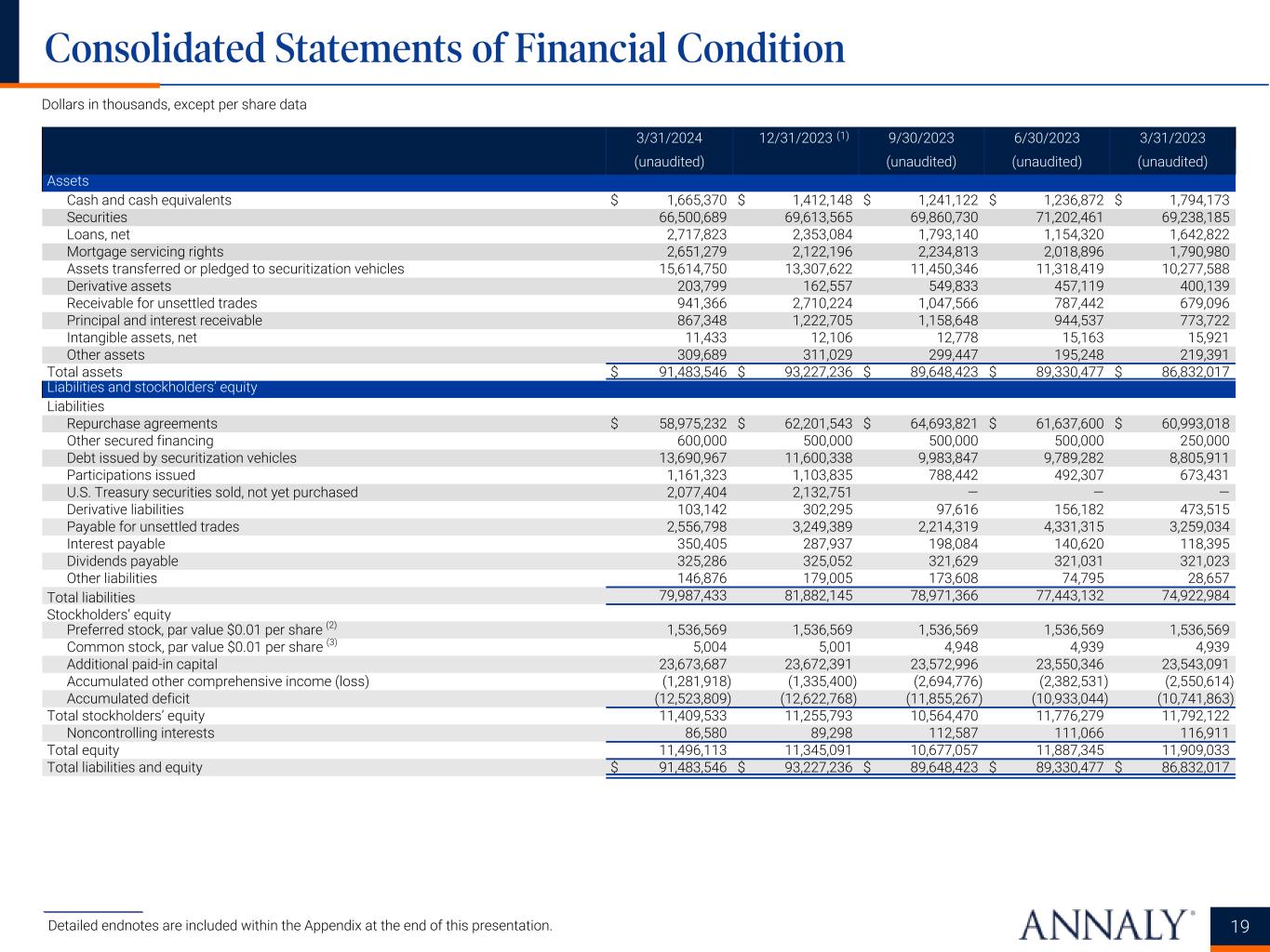 3/31/2024 12/31/2023 9/30/2023 6/30/2023 3/31/2023 (unaudited) (unaudited) (unaudited) (unaudited) Assets Cash and cash equivalents $ 1,665,370 $ 1,412,148 $ 1,241,122 $ 1,236,872 $ 1,794,173 Securities 66,500,689 69,613,565 69,860,730 71,202,461 69,238,185 Loans, net 2,717,823 2,353,084 1,793,140 1,154,320 1,642,822 Mortgage servicing rights 2,651,279 2,122,196 2,234,813 2,018,896 1,790,980 Assets transferred or pledged to securitization vehicles 15,614,750 13,307,622 11,450,346 11,318,419 10,277,588 Derivative assets 203,799 162,557 549,833 457,119 400,139 Receivable for unsettled trades 941,366 2,710,224 1,047,566 787,442 679,096 Principal and interest receivable 867,348 1,222,705 1,158,648 944,537 773,722 Intangible assets, net 11,433 12,106 12,778 15,163 15,921 Other assets 309,689 311,029 299,447 195,248 219,391 Total assets $ 91,483,546 $ 93,227,236 $ 89,648,423 $ 89,330,477 $ 86,832,017 Liabilities and stockholders’ equity Liabilities Repurchase agreements $ 58,975,232 $ 62,201,543 $ 64,693,821 $ 61,637,600 $ 60,993,018 Other secured financing 600,000 500,000 500,000 500,000 250,000 Debt issued by securitization vehicles 13,690,967 11,600,338 9,983,847 9,789,282 8,805,911 Participations issued 1,161,323 1,103,835 788,442 492,307 673,431 U.S. Treasury securities sold, not yet purchased 2,077,404 2,132,751 — — — Derivative liabilities 103,142 302,295 97,616 156,182 473,515 Payable for unsettled trades 2,556,798 3,249,389 2,214,319 4,331,315 3,259,034 Interest payable 350,405 287,937 198,084 140,620 118,395 Dividends payable 325,286 325,052 321,629 321,031 321,023 Other liabilities 146,876 179,005 173,608 74,795 28,657 Total liabilities 79,987,433 81,882,145 78,971,366 77,443,132 74,922,984 Stockholders’ equity Preferred stock, par value $0.01 per share (2) 1,536,569 1,536,569 1,536,569 1,536,569 1,536,569 Common stock, par value $0.01 per share (3) 5,004 5,001 4,948 4,939 4,939 Additional paid-in capital 23,673,687 23,672,391 23,572,996 23,550,346 23,543,091 Accumulated other comprehensive income (loss) (1,281,918) (1,335,400) (2,694,776) (2,382,531) (2,550,614) Accumulated deficit (12,523,809) (12,622,768) (11,855,267) (10,933,044) (10,741,863) Total stockholders’ equity 11,409,533 11,255,793 10,564,470 11,776,279 11,792,122 Noncontrolling interests 86,580 89,298 112,587 111,066 116,911 Total equity 11,496,113 11,345,091 10,677,057 11,887,345 11,909,033 Total liabilities and equity $ 91,483,546 $ 93,227,236 $ 89,648,423 $ 89,330,477 $ 86,832,017 (1) 19 Dollars in thousands, except per share data Consolidated Statements of Financial Condition ___________________ Detailed endnotes are included within the Appendix at the end of this presentation.