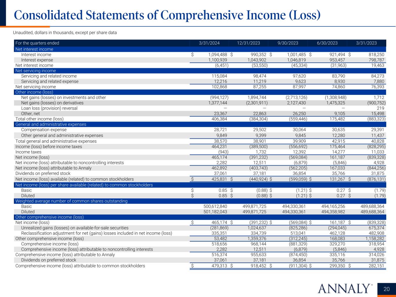 For the quarters ended 3/31/2024 12/31/2023 9/30/2023 6/30/2023 3/31/2023 Net interest income Interest income $ 1,094,488 $ 990,352 $ 1,001,485 $ 921,494 $ 818,250 Interest expense 1,100,939 1,043,902 1,046,819 953,457 798,787 Net interest income (6,451) (53,550) (45,334) (31,963) 19,463 Net servicing income Servicing and related income 115,084 98,474 97,620 83,790 84,273 Servicing and related expense 12,216 11,219 9,623 8,930 7,880 Net servicing income 102,868 87,255 87,997 74,860 76,393 Other income (loss) Net gains (losses) on investments and other (994,127) 1,894,744 (2,713,126) (1,308,948) 1,712 Net gains (losses) on derivatives 1,377,144 (2,301,911) 2,127,430 1,475,325 (900,752) Loan loss (provision) reversal — — — — 219 Other, net 23,367 22,863 26,250 9,105 15,498 Total other income (loss) 406,384 (384,304) (559,446) 175,482 (883,323) General and administrative expenses Compensation expense 28,721 29,502 30,064 30,635 29,391 Other general and administrative expenses 9,849 9,399 9,845 12,280 11,437 Total general and administrative expenses 38,570 38,901 39,909 42,915 40,828 Income (loss) before income taxes 464,231 (389,500) (556,692) 175,464 (828,295) Income taxes (943) 1,732 12,392 14,277 11,033 Net income (loss) 465,174 (391,232) (569,084) 161,187 (839,328) Net income (loss) attributable to noncontrolling interests 2,282 12,511 (6,879) (5,846) 4,928 Net income (loss) attributable to Annaly 462,892 (403,743) (562,205) 167,033 (844,256) Dividends on preferred stock 37,061 37,181 36,854 35,766 31,875 Net income (loss) available (related) to common stockholders $ 425,831 $ (440,924) $ (599,059) $ 131,267 $ (876,131) Net income (loss) per share available (related) to common stockholders Basic $ 0.85 $ (0.88) $ (1.21) $ 0.27 $ (1.79) Diluted $ 0.85 $ (0.88) $ (1.21) $ 0.27 $ (1.79) Weighted average number of common shares outstanding Basic 500,612,840 499,871,725 494,330,361 494,165,256 489,688,364 Diluted 501,182,043 499,871,725 494,330,361 494,358,982 489,688,364 Other comprehensive income (loss) Net income (loss) $ 465,174 $ (391,232) $ (569,084) $ 161,187 $ (839,328) Unrealized gains (losses) on available-for-sale securities (281,869) 1,024,637 (825,286) (294,045) 675,374 Reclassification adjustment for net (gains) losses included in net income (loss) 335,351 334,739 513,041 462,128 482,908 Other comprehensive income (loss) 53,482 1,359,376 (312,245) 168,083 1,158,282 Comprehensive income (loss) 518,656 968,144 (881,329) 329,270 318,954 Comprehensive income (loss) attributable to noncontrolling interests 2,282 12,511 (6,879) (5,846) 4,928 Comprehensive income (loss) attributable to Annaly 516,374 955,633 (874,450) 335,116 314,026 Dividends on preferred stock 37,061 37,181 36,854 35,766 31,875 Comprehensive income (loss) attributable to common stockholders $ 479,313 $ 918,452 $ (911,304) $ 299,350 $ 282,151 20 Unaudited, dollars in thousands, except per share data Consolidated Statements of Comprehensive Income (Loss)