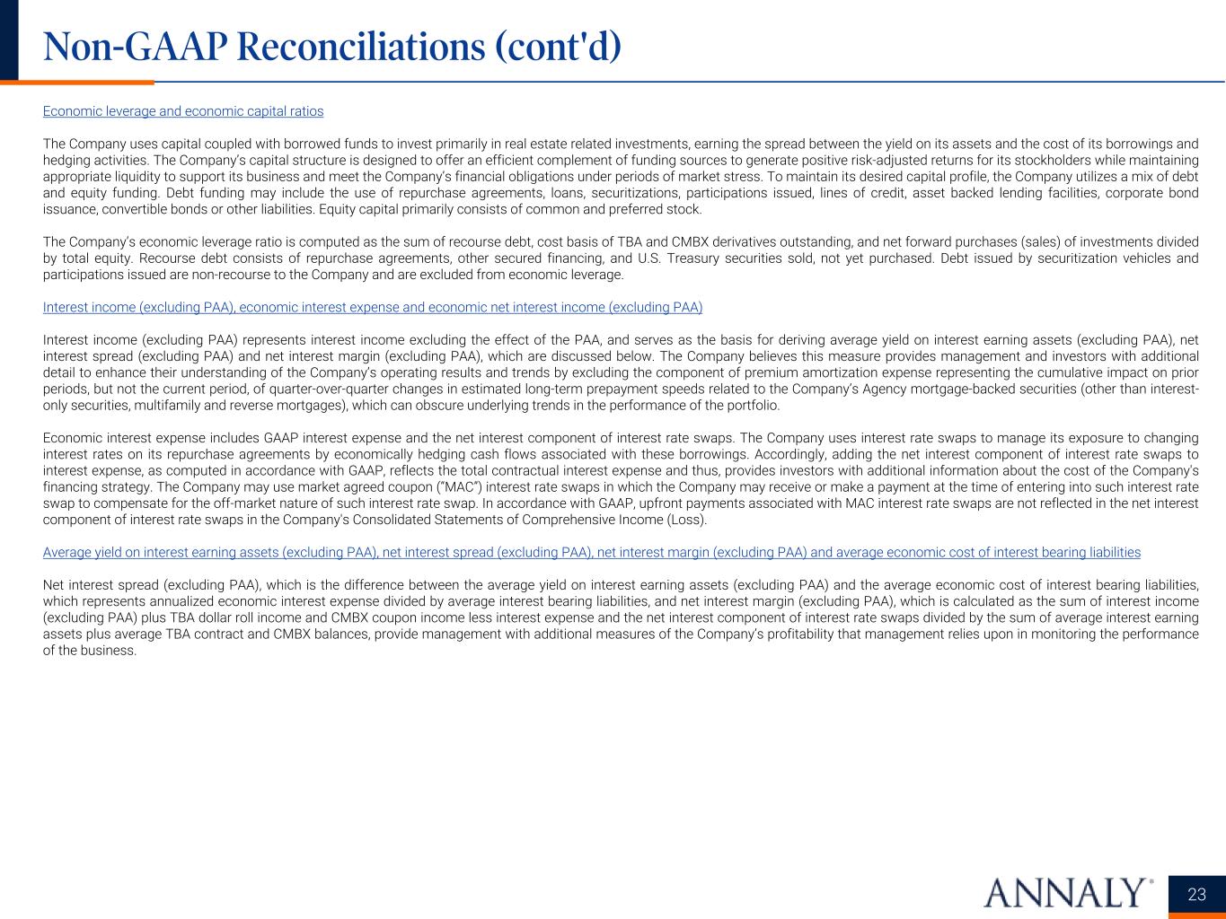 Economic leverage and economic capital ratios The Company uses capital coupled with borrowed funds to invest primarily in real estate related investments, earning the spread between the yield on its assets and the cost of its borrowings and hedging activities. The Company’s capital structure is designed to offer an efficient complement of funding sources to generate positive risk-adjusted returns for its stockholders while maintaining appropriate liquidity to support its business and meet the Company’s financial obligations under periods of market stress. To maintain its desired capital profile, the Company utilizes a mix of debt and equity funding. Debt funding may include the use of repurchase agreements, loans, securitizations, participations issued, lines of credit, asset backed lending facilities, corporate bond issuance, convertible bonds or other liabilities. Equity capital primarily consists of common and preferred stock. The Company’s economic leverage ratio is computed as the sum of recourse debt, cost basis of TBA and CMBX derivatives outstanding, and net forward purchases (sales) of investments divided by total equity. Recourse debt consists of repurchase agreements, other secured financing, and U.S. Treasury securities sold, not yet purchased. Debt issued by securitization vehicles and participations issued are non-recourse to the Company and are excluded from economic leverage. Interest income (excluding PAA), economic interest expense and economic net interest income (excluding PAA) Interest income (excluding PAA) represents interest income excluding the effect of the PAA, and serves as the basis for deriving average yield on interest earning assets (excluding PAA), net interest spread (excluding PAA) and net interest margin (excluding PAA), which are discussed below. The Company believes this measure provides management and investors with additional detail to enhance their understanding of the Company’s operating results and trends by excluding the component of premium amortization expense representing the cumulative impact on prior periods, but not the current period, of quarter-over-quarter changes in estimated long-term prepayment speeds related to the Company’s Agency mortgage-backed securities (other than interest- only securities, multifamily and reverse mortgages), which can obscure underlying trends in the performance of the portfolio. Economic interest expense includes GAAP interest expense and the net interest component of interest rate swaps. The Company uses interest rate swaps to manage its exposure to changing interest rates on its repurchase agreements by economically hedging cash flows associated with these borrowings. Accordingly, adding the net interest component of interest rate swaps to interest expense, as computed in accordance with GAAP, reflects the total contractual interest expense and thus, provides investors with additional information about the cost of the Company's financing strategy. The Company may use market agreed coupon (“MAC”) interest rate swaps in which the Company may receive or make a payment at the time of entering into such interest rate swap to compensate for the off-market nature of such interest rate swap. In accordance with GAAP, upfront payments associated with MAC interest rate swaps are not reflected in the net interest component of interest rate swaps in the Company's Consolidated Statements of Comprehensive Income (Loss). Average yield on interest earning assets (excluding PAA), net interest spread (excluding PAA), net interest margin (excluding PAA) and average economic cost of interest bearing liabilities Net interest spread (excluding PAA), which is the difference between the average yield on interest earning assets (excluding PAA) and the average economic cost of interest bearing liabilities, which represents annualized economic interest expense divided by average interest bearing liabilities, and net interest margin (excluding PAA), which is calculated as the sum of interest income (excluding PAA) plus TBA dollar roll income and CMBX coupon income less interest expense and the net interest component of interest rate swaps divided by the sum of average interest earning assets plus average TBA contract and CMBX balances, provide management with additional measures of the Company’s profitability that management relies upon in monitoring the performance of the business. 23 Non-GAAP Reconciliations (cont'd)