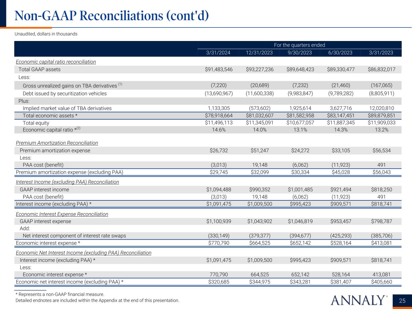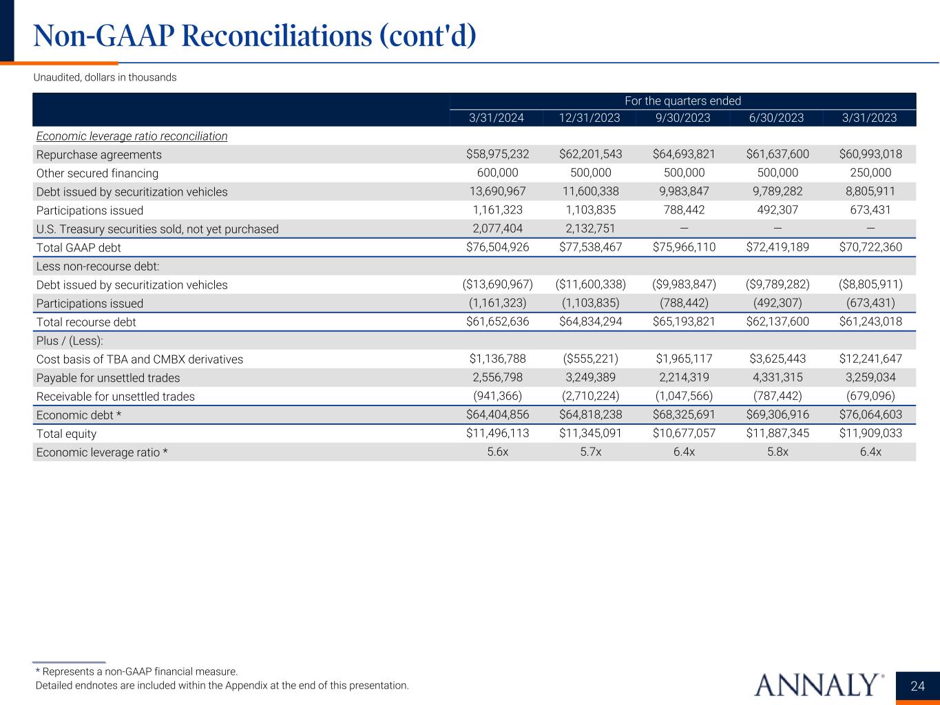 For the quarters ended 3/31/2024 12/31/2023 9/30/2023 6/30/2023 3/31/2023 Economic leverage ratio reconciliation Repurchase agreements $58,975,232 $62,201,543 $64,693,821 $61,637,600 $60,993,018 Other secured financing 600,000 500,000 500,000 500,000 250,000 Debt issued by securitization vehicles 13,690,967 11,600,338 9,983,847 9,789,282 8,805,911 Participations issued 1,161,323 1,103,835 788,442 492,307 673,431 U.S. Treasury securities sold, not yet purchased 2,077,404 2,132,751 — — — Total GAAP debt $76,504,926 $77,538,467 $75,966,110 $72,419,189 $70,722,360 Less non-recourse debt: Debt issued by securitization vehicles ($13,690,967) ($11,600,338) ($9,983,847) ($9,789,282) ($8,805,911) Participations issued (1,161,323) (1,103,835) (788,442) (492,307) (673,431) Total recourse debt $61,652,636 $64,834,294 $65,193,821 $62,137,600 $61,243,018 Plus / (Less): Cost basis of TBA and CMBX derivatives $1,136,788 ($555,221) $1,965,117 $3,625,443 $12,241,647 Payable for unsettled trades 2,556,798 3,249,389 2,214,319 4,331,315 3,259,034 Receivable for unsettled trades (941,366) (2,710,224) (1,047,566) (787,442) (679,096) Economic debt * $64,404,856 $64,818,238 $68,325,691 $69,306,916 $76,064,603 Total equity $11,496,113 $11,345,091 $10,677,057 $11,887,345 $11,909,033 Economic leverage ratio * 5.6x 5.7x 6.4x 5.8x 6.4x 24 Non-GAAP Reconciliations (cont'd) ___________________ * Represents a non-GAAP financial measure. Detailed endnotes are included within the Appendix at the end of this presentation. Unaudited, dollars in thousands
