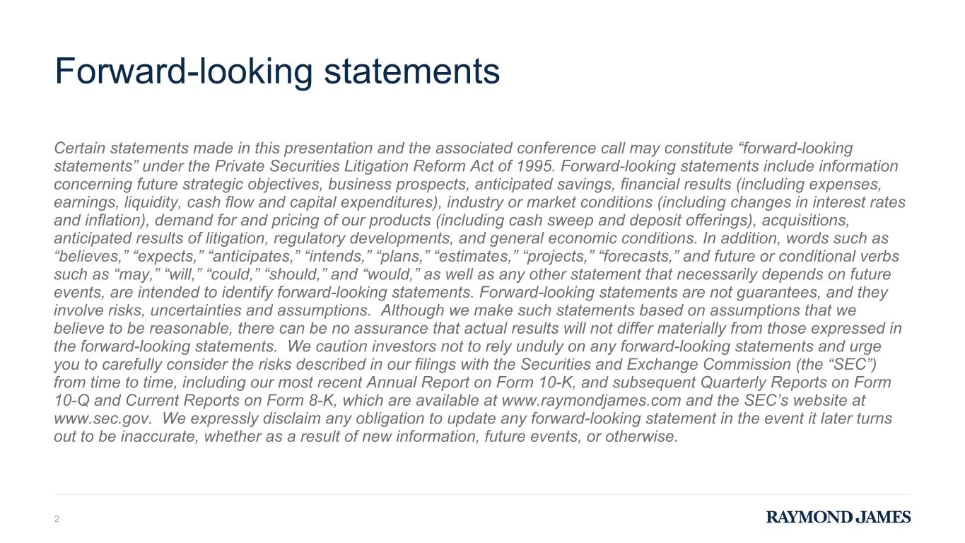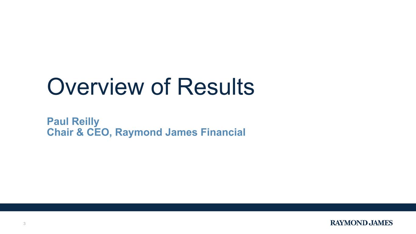 Forward-looking statements Certain statements made in this presentation and the associated conference call may constitute “forward-looking statements” under the Private Securities Litigation Reform Act of 1995. Forward-looking statements include information concerning future strategic objectives, business prospects, anticipated savings, financial results (including expenses, earnings, liquidity, cash flow and capital expenditures), industry or market conditions (including changes in interest rates and inflation), demand for and pricing of our products (including cash sweep and deposit offerings), acquisitions, anticipated results of litigation, regulatory developments, and general economic conditions. In addition, words such as “believes,” “expects,” “anticipates,” “intends,” “plans,” “estimates,” “projects,” “forecasts,” and future or conditional verbs such as “may,” “will,” “could,” “should,” and “would,” as well as any other statement that necessarily depends on future events, are intended to identify forward-looking statements. Forward-looking statements are not guarantees, and they involve risks, uncertainties and assumptions. Although we make such statements based on assumptions that we believe to be reasonable, there can be no assurance that actual results will not differ materially from those expressed in the forward-looking statements. We caution investors not to rely unduly on any forward-looking statements and urge you to carefully consider the risks described in our filings with the Securities and Exchange Commission (the “SEC”) from time to time, including our most recent Annual Report on Form 10-K, and subsequent Quarterly Reports on Form 10-Q and Current Reports on Form 8-K, which are available at www.raymondjames.com and the SEC’s website at www.sec.gov. We expressly disclaim any obligation to update any forward-looking statement in the event it later turns out to be inaccurate, whether as a result of new information, future events, or otherwise. 2
