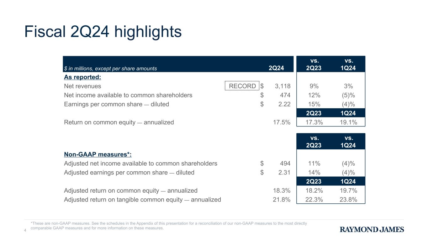 Footnotes (1) The six months ended March 31, 2023 included the favorable impact of a $32 million insurance settlement received during the period related to a previously settled legal matter. This item has been reflected as an offset to Other expenses within our Other segment. In the computation of our non-GAAP financial measures, we have reversed the favorable impact of this item on adjusted pre-tax income and adjusted net income available to common shareholders. See the schedules on the previous pages for a reconciliation of non-GAAP financial measures to the most directly comparable GAAP measures and for more information on these measures. (2) Earnings per common share is computed by dividing net income available to common shareholders (less allocation of earnings and dividends to participating securities) by weighted-average common shares outstanding (basic or diluted as applicable) for each respective period or, in the case of adjusted earnings per common share, computed by dividing adjusted net income available to common shareholders (less allocation of earnings and dividends to participating securities) by weighted-average common shares outstanding (basic or diluted as applicable) for each respective period. The allocations of earnings and dividends to participating securities were $1 million for each of the three months ended June 30, 2023, September 30, 2023, December 31, 2023, and March 31, 2024, $2 million for the three months ended March 31, 2023, $3 million for the six months ended March 31, 2023, and $2 million for the six months ended March 31, 2024. (3) Book value per share is computed by dividing total common equity attributable to Raymond James Financial, Inc. by the number of common shares outstanding at the end of each respective period or, in the case of tangible book value per share, computed by dividing tangible common equity by the number of common shares outstanding at the end of each respective period. (4) These are non-GAAP financial measures. See the schedules on the previous pages for a reconciliation of non-GAAP financial measures to the most directly comparable GAAP measures and for more information on these measures. (5) Estimated. (6) Return on common equity is computed by dividing annualized net income available to common shareholders by average common equity for each respective period or, in the case of return on tangible common equity, computed by dividing annualized net income available to common shareholders by average tangible common equity for each respective period. Adjusted return on common equity is computed by dividing annualized adjusted net income available to common shareholders by adjusted average common equity for each respective period, or in the case of adjusted return on tangible common equity, computed by dividing annualized adjusted net income available to common shareholders by adjusted average tangible common equity for each respective period. Tangible common equity is defined as total common equity attributable to Raymond James Financial, Inc. less goodwill and identifiable intangible assets, net of related deferred taxes. (7) Pre-tax margin is computed by dividing pre-tax income by net revenues for each respective period or, in the case of adjusted pre-tax margin, computed by dividing adjusted pre-tax income by net revenues for each respective period. (8) Total compensation ratio is computed by dividing compensation, commissions and benefits expense by net revenues for each respective period or, in the case of adjusted total compensation ratio, computed by dividing adjusted compensation, commissions and benefits expense by net revenues for each respective period. (9) Domestic Private Client Group net new assets represents domestic Private Client Group client inflows, including dividends and interest, less domestic Private Client Group client outflows, including commissions, advisory fees, and other fees. The Domestic Private Client Group net new asset growth — annualized percentage is based on the beginning Domestic Private Client Group assets under administration balance for the indicated period. (10) These metrics include the impact of the departure of approximately 60 financial advisors and approximately $5 billion of assets under administration, representing the portion of advisors previously associated through a single relationship in the firm’s independent contractors division whose affiliation with the firm ended in the fiscal third quarter of 2023. (11) We earn fees from the RJBDP, a multi-bank sweep program in which clients’ cash deposits in their brokerage accounts are swept into interest-bearing deposit accounts at Raymond James Bank and TriState Capital Bank, which are included in our Bank segment, as well as various third-party banks. RJBDP balances swept to our Bank segment are reflected in Bank deposits on our Consolidated Statement of Financial Condition. RJBDP balances swept to third-party banks are not included in our bank deposit liability balance reflected on our Consolidated Statement of Financial Condition given those deposits are held by third-party banks. Fees earned from the RJBDP are included in “Account and service fees” on our Consolidated Statements of Income, and those fees earned by the Private Client Group segment on deposits held by our Bank segment are eliminated in consolidation. (12) Our Enhanced Savings Program is a deposit offering in which Private Client Group clients may deposit cash in a high-yield Raymond James Bank account. ESP balances held at Raymond James Bank as of the respective period end are reflected in Bank deposits on our Consolidated Statement of Financial Condition. As of March 31, 2024, we had placed $324 million of ESP deposits with third-party banks, and accordingly such deposits were not included in our bank deposit liability balance reflected on our Consolidated Statement of Financial Condition. (13) Average yield on RJBDP - third-party banks is computed by divid