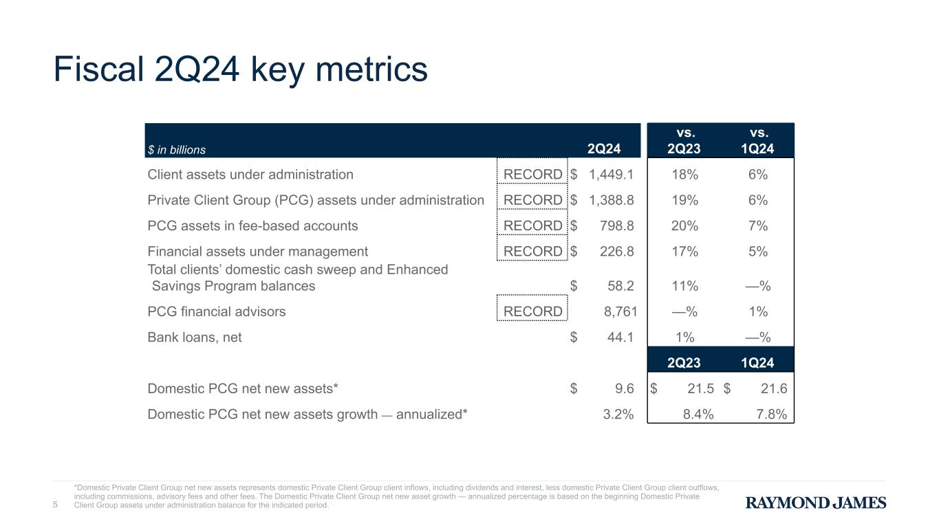 As of % change from Client asset metrics ($ in billions) March 31, 2023 June 30, 2023 September 30, 2023 December 31, 2023 March 31, 2024 March 31, 2023 December 31, 2023 Client assets under administration $ 1,224.4 $ 1,280.9 $ 1,256.5 $ 1,370.6 $ 1,449.1 18 % 6 % Private Client Group assets under administration $ 1,171.1 $ 1,227.0 $ 1,201.2 $ 1,310.5 $ 1,388.8 19 % 6 % Private Client Group assets in fee-based accounts $ 666.3 $ 697.0 $ 683.2 $ 746.6 $ 798.8 20 % 7 % Financial assets under management $ 194.4 $ 200.7 $ 196.4 $ 215.0 $ 226.8 17 % 5 % Three months ended Six months ended Net new assets metrics (9) ($ in millions) March 31, 2023 June 30, 2023 September 30, 2023 December 31, 2023 March 31, 2024 March 31, 2023 March 31, 2024 Domestic Private Client Group net new assets (10) $ 21,473 $ 14,386 $ 14,169 $ 21,575 $ 9,648 $ 44,699 $ 31,223 Domestic Private Client Group net new assets growth — annualized (10) 8.4 % 5.4 % 5.0 % 7.8 % 3.2 % 9.4 % 5.7 % As of % change from Private Client Group financial advisors March 31, 2023 June 30, 2023 September 30, 2023 December 31, 2023 March 31, 2024 March 31, 2023 December 31, 2023 Employees 3,628 3,654 3,693 3,718 3,747 3 % 1 % Independent contractors (10) 5,098 5,050 5,019 4,992 5,014 (2) % — % Total advisors (10) 8,726 8,704 8,712 8,710 8,761 — % 1 % As of % change from Clients' domestic cash sweep and Enhanced Savings Program balances ($ in millions) March 31, 2023 June 30, 2023 September 30, 2023 December 31, 2023 March 31, 2024 March 31, 2023 December 31, 2023 Raymond James Bank Deposit Program (“RJBDP”): (11) Bank segment (11) $ 37,682 $ 27,915 $ 25,355 $ 23,912 $ 23,405 (38) % (2) % Third-party banks 9,408 16,923 15,858 17,820 18,234 94 % 2 % Subtotal RJBDP 47,090 44,838 41,213 41,732 41,639 (12) % — % Client Interest Program 2,385 1,915 1,620 1,765 1,715 (28) % (3) % Total clients’ domestic cash sweep balances 49,475 46,753 42,833 43,497 43,354 (12) % — % Enhanced Savings Program ("ESP") (12) 2,746 11,225 13,592 14,476 14,863 441 % 3 % Total clients’ domestic cash sweep and ESP balances $ 52,221 $ 57,978 $ 56,425 $ 57,973 $ 58,217 11 % — % Three months ended % change from Six months ended Net interest income and RJBDP fees ($ in millions) March 31, 2023 June 30, 2023 September 30, 2023 December 31, 2023 March 31, 2024 March 31, 2023 December 31, 2023 March 31, 2023 March 31, 2024 % change Net interest income and RJBDP fees (third-party banks) $ 731 $ 708 $ 711 $ 698 $ 689 (6) % (1) % $ 1,454 $ 1,387 (5) % Average yield on RJBDP - third-party banks (13) 3.25 % 3.37 % 3.60 % 3.66 % 3.59 % 2.93 % 3.62 % RAYMOND JAMES FINANCIAL, INC. Consolidated Selected Key Metrics (Unaudited) Please refer to the footnotes at the end of this supplement for additional information. 5