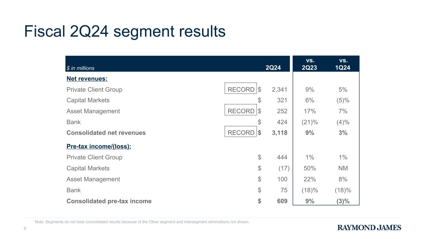 Fiscal 2Q24 key metrics 5 $ in billions 2Q24 vs. 2Q23 vs. 1Q24 Client assets under administration RECORD $ 1,449.1 18% 6% Private Client Group (PCG) assets under administration RECORD $ 1,388.8 19% 6% PCG assets in fee-based accounts RECORD $ 798.8 20% 7% Financial assets under management RECORD $ 226.8 17% 5% Total clients’ domestic cash sweep and Enhanced Savings Program balances $ 58.2 11% —% PCG financial advisors RECORD 8,761 —% 1% Bank loans, net $ 44.1 1% —% 2Q23 1Q24 Domestic PCG net new assets* $ 9.6 $ 21.5 $ 21.6 Domestic PCG net new assets growth — annualized* 3.2 % 8.4 % 7.8 % *Domestic Private Client Group net new assets represents domestic Private Client Group client inflows, including dividends and interest, less domestic Private Client Group client outflows, including commissions, advisory fees and other fees. The Domestic Private Client Group net new asset growth — annualized percentage is based on the beginning Domestic Private Client Group assets under administration balance for the indicated period.