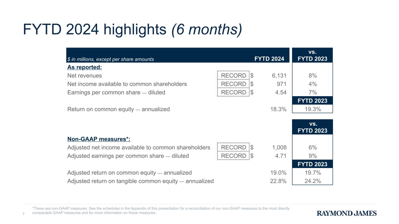 For the first six months of the fiscal year, record net revenues of $6.13 billion increased 8%, record earnings per diluted share of $4.54 increased 7%, and record adjusted earnings per diluted share of $4.71(1) increased 9% over the first half of fiscal 2023. The Private Client Group segment generated record net revenues and pre-tax income, and the Asset Management segment produced record net revenues, during the first six months of the fiscal year. For this period, annualized return on common equity was 18.3% and annualized adjusted return on tangible common equity was 22.8%(1).