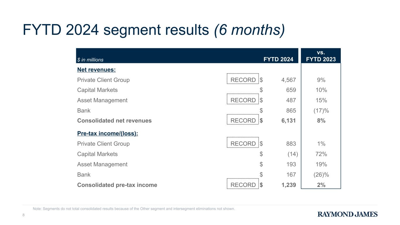 Three months ended % change from Six months ended $ in millions March 31, 2023 June 30, 2023 September 30, 2023 December 31, 2023 March 31, 2024 March 31, 2023 December 31, 2023 March 31, 2023 March 31, 2024 % change Revenues: Brokerage revenues: Fixed income $ 96 $ 78 $ 71 $ 102 $ 88 (8) % (14) % $ 196 $ 190 (3) % Equity 34 32 30 38 34 — % (11) % 68 72 6 % Total brokerage revenues 130 110 101 140 122 (6) % (13) % 264 262 (1) % Investment banking: Merger & acquisition and advisory 87 88 141 118 107 23 % (9) % 189 225 19 % Equity underwriting 29 25 16 26 23 (21) % (12) % 44 49 11 % Debt underwriting 29 28 37 26 41 41 % 58 % 45 67 49 % Total investment banking 145 141 194 170 171 18 % 1 % 278 341 23 % Interest income 21 21 23 23 26 24 % 13 % 44 49 11 % Affordable housing investments business revenues 23 21 41 23 22 (4) % (4) % 47 45 (4) % All other 3 4 3 4 4 33 % — % 7 8 14 % Total revenues 322 297 362 360 345 7 % (4) % 640 705 10 % Interest expense (20) (21) (21) (22) (24) 20 % 9 % (43) (46) 7 % Net revenues 302 276 341 338 321 6 % (5) % 597 659 10 % Non-interest expenses: Compensation, commissions and benefits 231 220 238 238 240 4 % 1 % 444 478 8 % Non-compensation expenses 105 90 110 97 98 (7) % 1 % 203 195 (4) % Total non-interest expenses 336 310 348 335 338 1 % 1 % 647 673 4 % Pre-tax income/(loss) $ (34) $ (34) $ (7) $ 3 $ (17) 50 % NM $ (50) $ (14) 72 % RAYMOND JAMES FINANCIAL, INC. Segment Results - Capital Markets (Unaudited) Please refer to the footnotes at the end of this supplement for additional information. 7