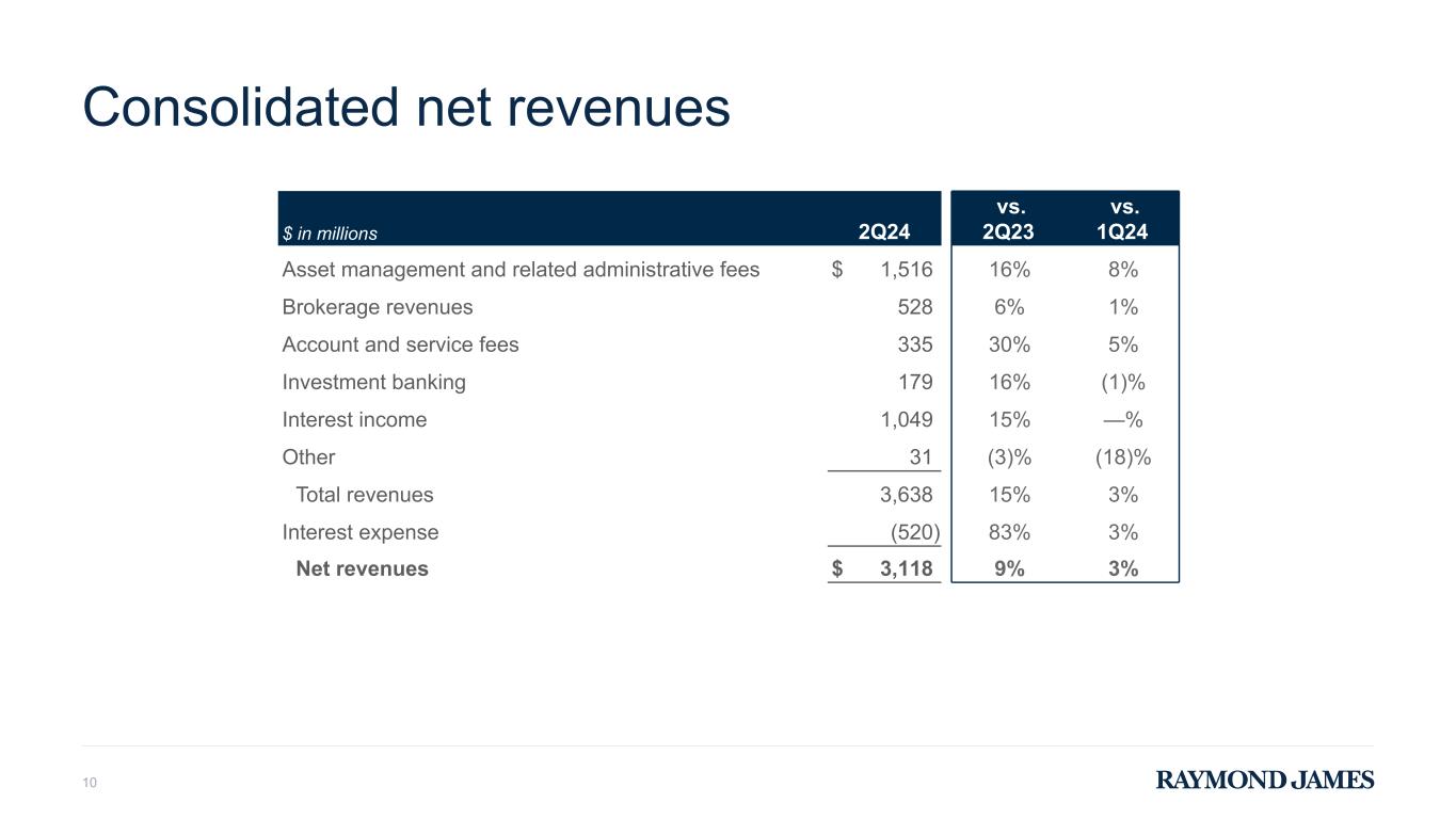 Three months ended % change from Six months ended $ in millions March 31, 2023 June 30, 2023 September 30, 2023 December 31, 2023 March 31, 2024 March 31, 2023 December 31, 2023 March 31, 2023 March 31, 2024 % change Revenues: Interest income $ 749 $ 826 $ 847 $ 872 $ 868 16 % — % $ 1,425 $ 1,740 22 % Interest expense (219) (329) (408) (446) (455) 108 % 2 % (404) (901) 123 % Net interest income 530 497 439 426 413 (22) % (3) % 1,021 839 (18) % All other 10 17 12 15 11 10 % (27) % 27 26 (4) % Net revenues 540 514 451 441 424 (21) % (4) % 1,048 865 (17) % Non-interest expenses: Compensation and benefits 48 48 41 43 48 — % 12 % 88 91 3 % Non-compensation expenses: Bank loan provision for credit losses 28 54 36 12 21 (25) % 75 % 42 33 (21) % RJBDP fees to Private Client Group (11) 311 277 237 223 206 (34) % (8) % 579 429 (26) % All other 62 69 59 71 74 19 % 4 % 112 145 29 % Total non-compensation expenses 401 400 332 306 301 (25) % (2) % 733 607 (17) % Total non-interest expenses 449 448 373 349 349 (22) % — % 821 698 (15) % Pre-tax income $ 91 $ 66 $ 78 $ 92 $ 75 (18) % (18) % $ 227 $ 167 (26) % RAYMOND JAMES FINANCIAL, INC. Segment Results - Bank (Unaudited) Please refer to the footnotes at the end of this supplement for additional information. 9