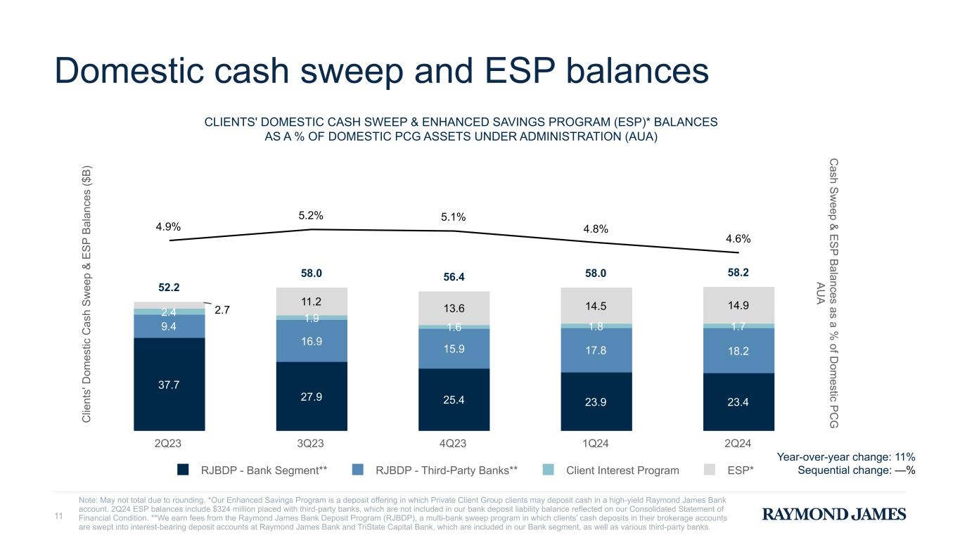 | (11) | | Our Enhanced Savings Program is a deposit offering in which Private Client Group clients may deposit cash in a high-yield Raymond James Bank account. ESP balances held at Raymond James Bank as of the respective period end are reflected in Bank deposits on our Consolidated Statement of Financial Condition and substantially all are reflected within interest-bearing demand deposits in our net interest disclosures in this release. As of March 31, 2024, we had placed $324 million of ESP deposits with third-party banks, and accordingly such deposits held at third-party banks were not included in our bank deposit liability balance on our Consolidated Statement of Financial Condition. |
