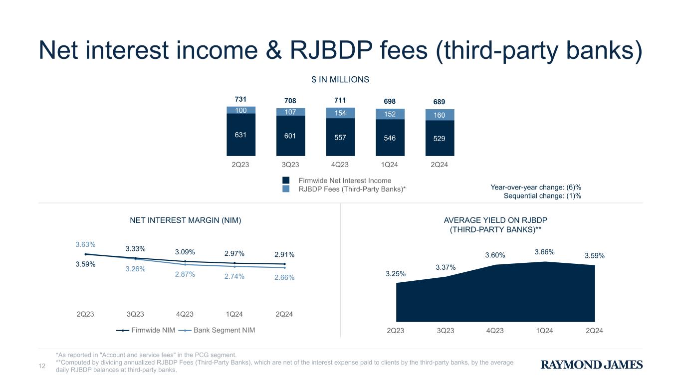 Domestic cash sweep and ESP balances 11 C lie nt s' D om es tic C as h S w ee p & E S P B al an ce s ($ B ) C ash S w eep & E S P B alances as a % of D om estic P C G A U A CLIENTS' DOMESTIC CASH SWEEP & ENHANCED SAVINGS PROGRAM (ESP)* BALANCES AS A % OF DOMESTIC PCG ASSETS UNDER ADMINISTRATION (AUA) 37.7 27.9 25.4 23.9 23.4 9.4 16.9 15.9 17.8 18.2 2.4 1.9 1.6 1.8 1.7 11.2 13.6 14.5 14.9 52.2 58.0 56.4 58.0 58.2 4.9% 5.2% 5.1% 4.8% 4.6% RJBDP - Bank Segment** RJBDP - Third-Party Banks** Client Interest Program ESP* 2Q23 3Q23 4Q23 1Q24 2Q24 Note: May not total due to rounding. *Our Enhanced Savings Program is a deposit offering in which Private Client Group clients may deposit cash in a high-yield Raymond James Bank account. 2Q24 ESP balances include $324 million placed with third-party banks, which are not included in our bank deposit liability balance reflected on our Consolidated Statement of Financial Condition. **We earn fees from the Raymond James Bank Deposit Program (RJBDP), a multi-bank sweep program in which clients’ cash deposits in their brokerage accounts are swept into interest-bearing deposit accounts at Raymond James Bank and TriState Capital Bank, which are included in our Bank segment, as well as various third-party banks. Year-over-year change: 11% Sequential change: —% 2.7