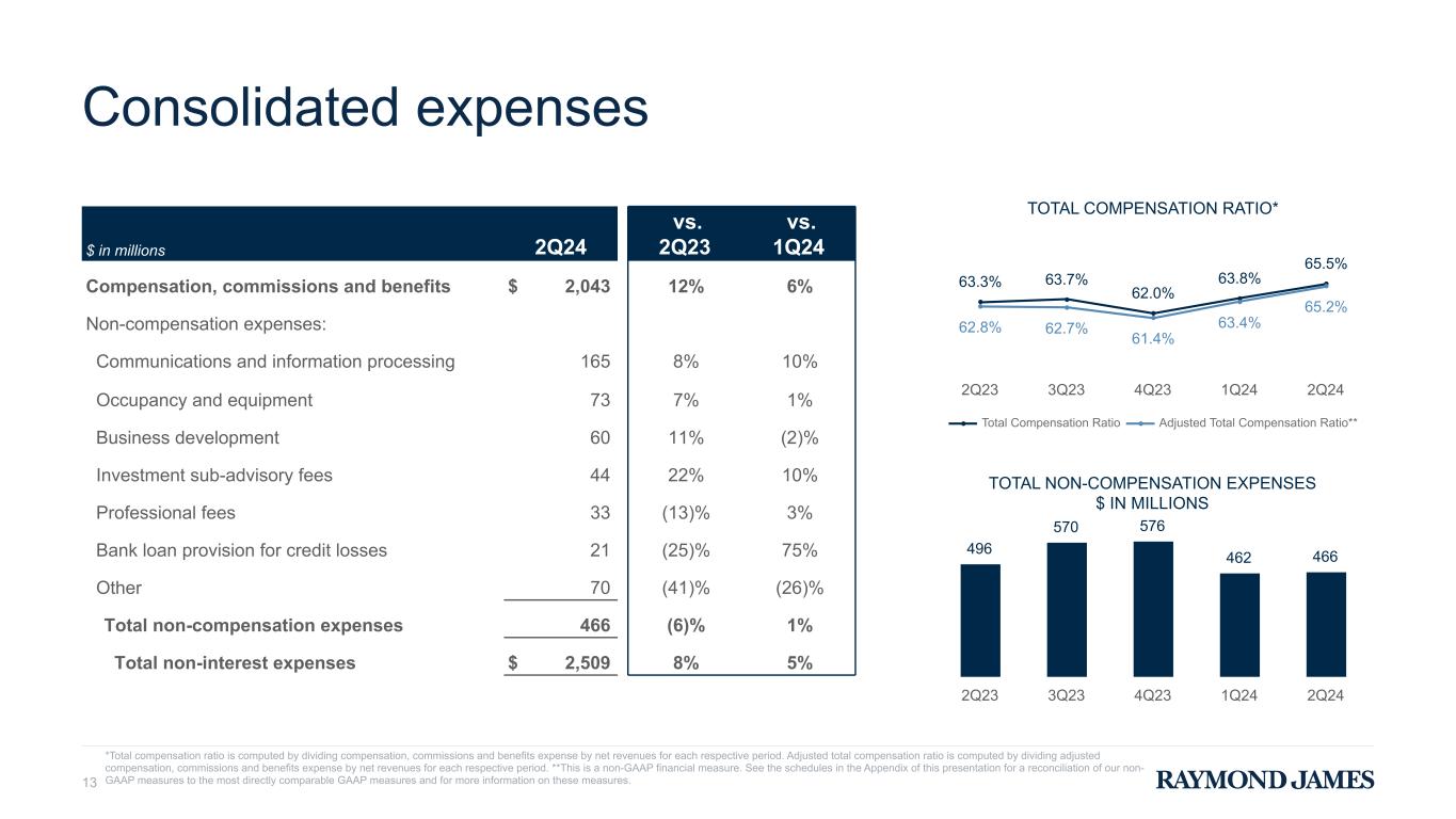 Net interest income & RJBDP fees (third-party banks) 12 *As reported in "Account and service fees" in the PCG segment. **Computed by dividing annualized RJBDP Fees (Third-Party Banks), which are net of the interest expense paid to clients by the third-party banks, by the average daily RJBDP balances at third-party banks. $ IN MILLIONS 731 708 711 698 689 631 601 557 546 529 100 107 154 152 160 Firmwide Net Interest Income RJBDP Fees (Third-Party Banks)* 2Q23 3Q23 4Q23 1Q24 2Q24 NET INTEREST MARGIN (NIM) 3.63% 3.26% 2.87% 2.74% 2.66% 3.59% 3.33% 3.09% 2.97% 2.91% Firmwide NIM Bank Segment NIM 2Q23 3Q23 4Q23 1Q24 2Q24 AVERAGE YIELD ON RJBDP (THIRD-PARTY BANKS)** 3.25% 3.37% 3.60% 3.66% 3.59% 2Q23 3Q23 4Q23 1Q24 2Q24 Year-over-year change: (6)% Sequential change: (1)%
