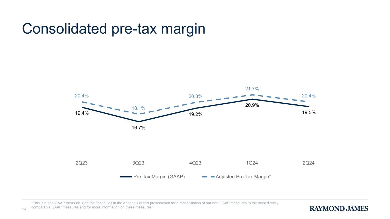 Consolidated expenses 13 $ in millions 2Q24 vs. 2Q23 vs. 1Q24 Compensation, commissions and benefits $ 2,043 12% 6% Non-compensation expenses: Communications and information processing 165 8% 10% Occupancy and equipment 73 7% 1% Business development 60 11% (2)% Investment sub-advisory fees 44 22% 10% Professional fees 33 (13)% 3% Bank loan provision for credit losses 21 (25)% 75% Other 70 (41)% (26)% Total non-compensation expenses 466 (6)% 1% Total non-interest expenses $ 2,509 8% 5% *Total compensation ratio is computed by dividing compensation, commissions and benefits expense by net revenues for each respective period. Adjusted total compensation ratio is computed by dividing adjusted compensation, commissions and benefits expense by net revenues for each respective period. **This is a non-GAAP financial measure. See the schedules in the Appendix of this presentation for a reconciliation of our non- GAAP measures to the most directly comparable GAAP measures and for more information on these measures. TOTAL NON-COMPENSATION EXPENSES $ IN MILLIONS 496 570 576 462 466 2Q23 3Q23 4Q23 1Q24 2Q24 TOTAL COMPENSATION RATIO* 63.3% 63.7% 62.0% 63.8% 65.5% 62.8% 62.7% 61.4% 63.4% 65.2% Total Compensation Ratio Adjusted Total Compensation Ratio** 2Q23 3Q23 4Q23 1Q24 2Q24