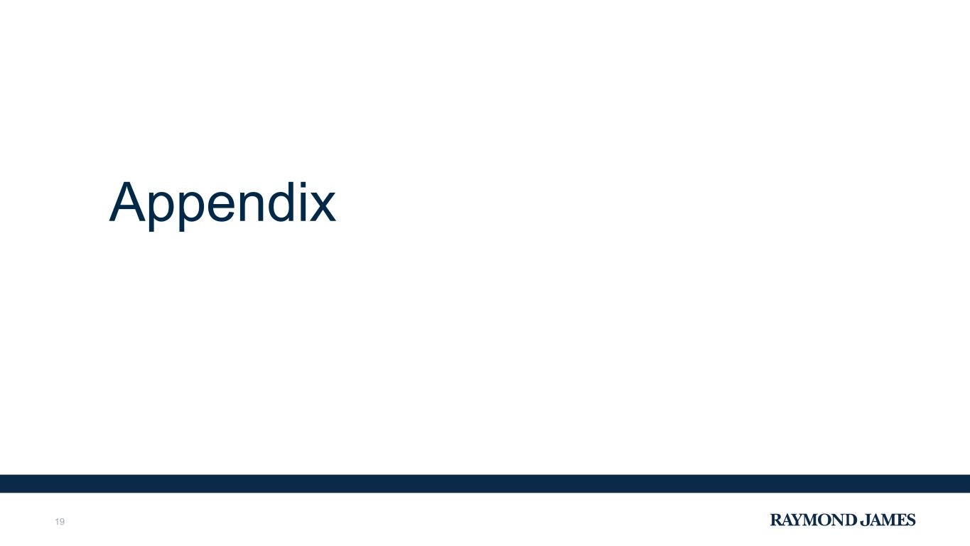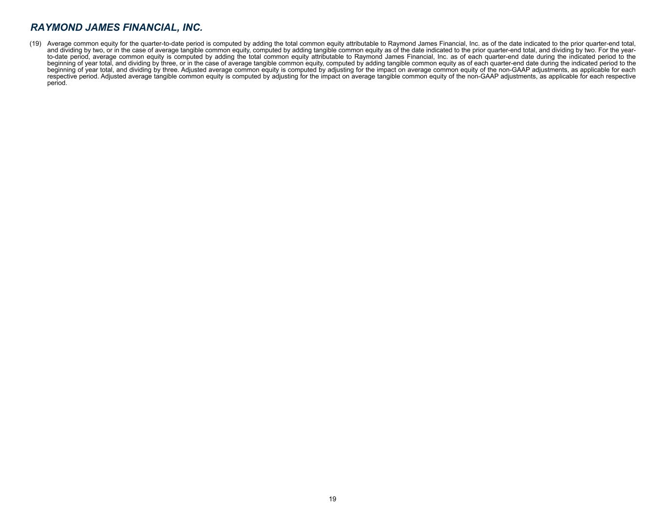 (19) Average common equity for the quarter-to-date period is computed by adding the total common equity attributable to Raymond James Financial, Inc. as of the date indicated to the prior quarter-end total, and dividing by two, or in the case of average tangible common equity, computed by adding tangible common equity as of the date indicated to the prior quarter-end total, and dividing by two. For the year- to-date period, average common equity is computed by adding the total common equity attributable to Raymond James Financial, Inc. as of each quarter-end date during the indicated period to the beginning of year total, and dividing by three, or in the case of average tangible common equity, computed by adding tangible common equity as of each quarter-end date during the indicated period to the beginning of year total, and dividing by three. Adjusted average common equity is computed by adjusting for the impact on average common equity of the non-GAAP adjustments, as applicable for each respective period. Adjusted average tangible common equity is computed by adjusting for the impact on average tangible common equity of the non-GAAP adjustments, as applicable for each respective period. RAYMOND JAMES FINANCIAL, INC. 19