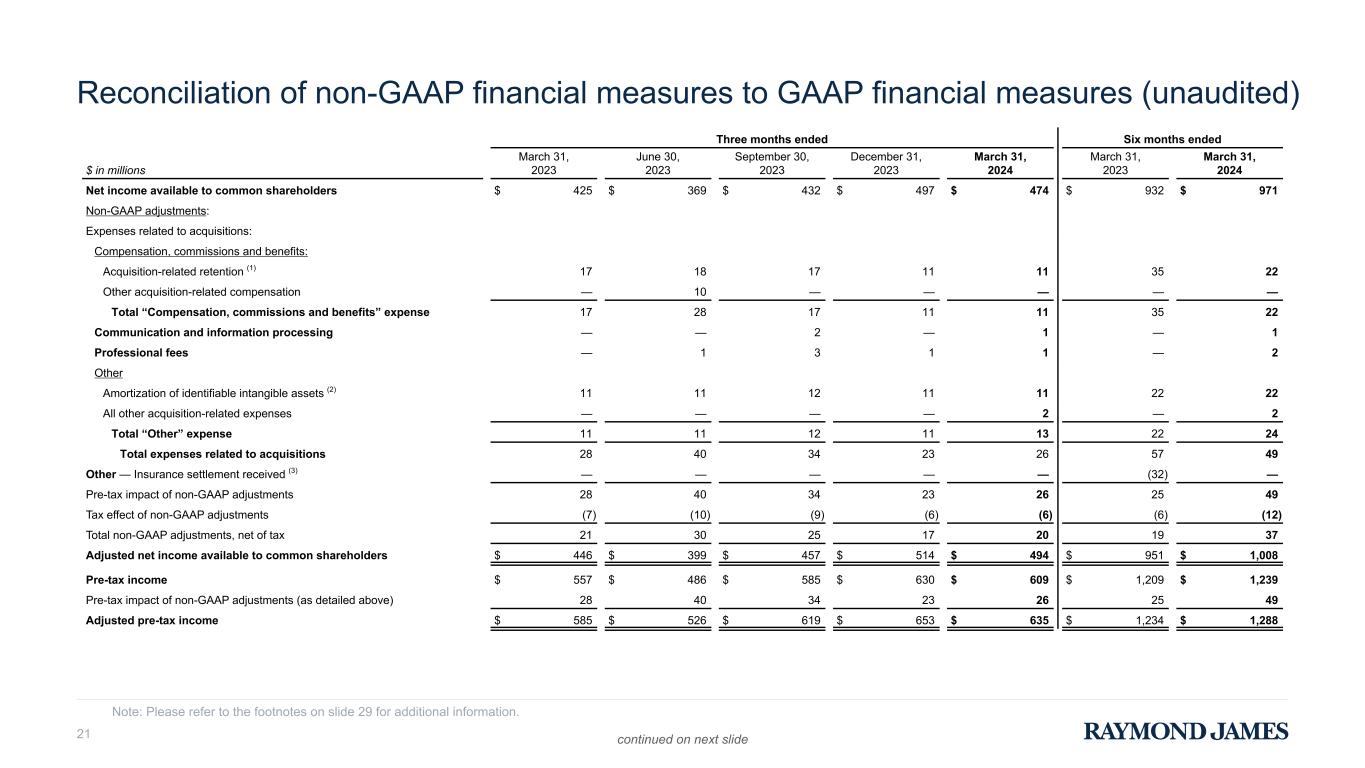 Reconciliation of non-GAAP financial measures to GAAP financial measures (Unaudited) We utilize certain non-GAAP financial measures as additional measures to aid in, and enhance, the understanding of our financial results and related measures. These non-GAAP financial measures have been separately identified in this document. We believe a certain of these non-GAAP financial measures provide useful information to management and investors by excluding certain material items that may not be indicative of our core operating results. We utilize these non-GAAP financial measures in assessing the financial performance of the business, as they facilitate a comparison of current- and prior-period results. We believe that return on tangible common equity and tangible book value per share are meaningful to investors as they facilitate comparisons of our results to the results of other companies. In the following tables, the tax effect of non-GAAP adjustments reflects the statutory rate associated with each non-GAAP item. These non-GAAP financial measures should be considered in addition to, and not as a substitute for, measures of financial performance prepared in accordance with GAAP. In addition, our non-GAAP financial measures may not be comparable to similarly titled non-GAAP financial measures of other companies. The following tables provide a reconciliation of non-GAAP financial measures to the most directly comparable GAAP measures for those periods which include non-GAAP adjustments. Three months ended Six months ended $ in millions March 31, 2023 June 30, 2023 September 30, 2023 December 31, 2023 March 31, 2024 March 31, 2023 March 31, 2024 Net income available to common shareholders $ 425 $ 369 $ 432 $ 497 $ 474 $ 932 $ 971 Non-GAAP adjustments: Expenses related to acquisitions: Compensation, commissions and benefits: Acquisition-related retention (17) 17 18 17 11 11 35 22 Other acquisition-related compensation — 10 — — — — — Total “Compensation, commissions and benefits” expense 17 28 17 11 11 35 22 Communication and information processing — — 2 — 1 — 1 Professional fees — 1 3 1 1 — 2 Other: Amortization of identifiable intangible assets (18) 11 11 12 11 11 22 22 All other acquisition-related expenses — — — — 2 — 2 Total “Other” expense 11 11 12 11 13 22 24 Total expenses related to acquisitions 28 40 34 23 26 57 49 Other — Insurance settlement received (1) — — — — — (32) — Pre-tax impact of non-GAAP adjustments 28 40 34 23 26 25 49 Tax effect of non-GAAP adjustments (7) (10) (9) (6) (6) (6) (12) Total non-GAAP adjustments, net of tax 21 30 25 17 20 19 37 Adjusted net income available to common shareholders (4) $ 446 $ 399 $ 457 $ 514 $ 494 $ 951 $ 1,008 Pre-tax income $ 557 $ 486 $ 585 $ 630 $ 609 $ 1,209 $ 1,239 Pre-tax impact of non-GAAP adjustments (as detailed above) 28 40 34 23 26 25 49 Adjusted pre-tax income (4) $ 585 $ 526 $ 619 $ 653 $ 635 $ 1,234 $ 1,288 Compensation, commissions and benefits expense $ 1,820 $ 1,851 $ 1,892 $ 1,921 $ 2,043 $ 3,556 $ 3,964 Less: Total compensation-related acquisition expenses (as detailed above) 17 28 17 11 11 35 22 Adjusted “Compensation, commissions and benefits” expense (4) $ 1,803 $ 1,823 $ 1,875 $ 1,910 $ 2,032 $ 3,521 $ 3,942 RAYMOND JAMES FINANCIAL, INC. Please refer to the footnotes at the end of this supplement for additional information. 12