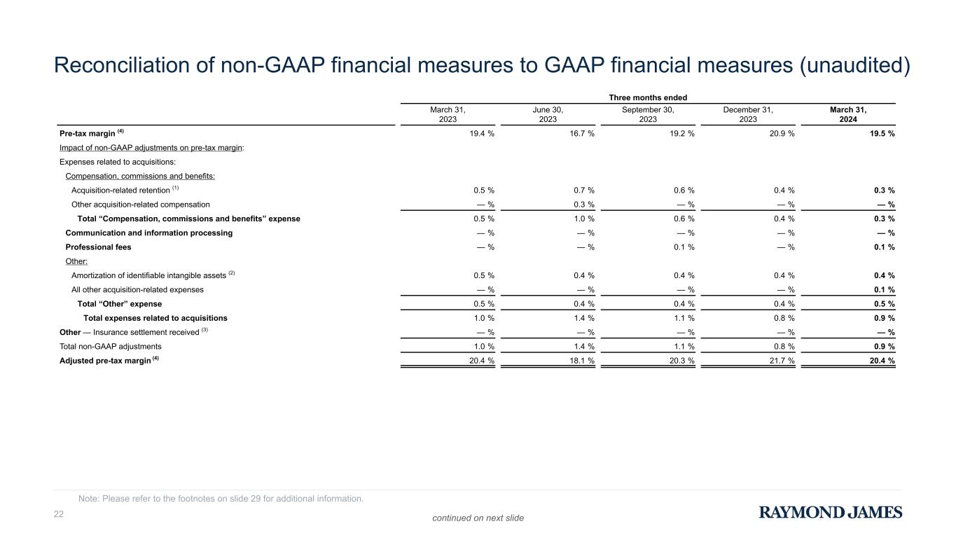Reconciliation of non-GAAP financial measures to GAAP financial measures (unaudited) Note: Please refer to the footnotes on slide 29 for additional information. continued on next slide Three months ended Six months ended $ in millions March 31, 2023 June 30, 2023 September 30, 2023 December 31, 2023 March 31, 2024 March 31, 2023 March 31, 2024 Net income available to common shareholders $ 425 $ 369 $ 432 $ 497 $ 474 $ 932 $ 971 Non-GAAP adjustments: Expenses related to acquisitions: Compensation, commissions and benefits: Acquisition-related retention (1) 17 18 17 11 11 35 22 Other acquisition-related compensation — 10 — — — — — Total “Compensation, commissions and benefits” expense 17 28 17 11 11 35 22 Communication and information processing — — 2 — 1 — 1 Professional fees — 1 3 1 1 — 2 Other Amortization of identifiable intangible assets (2) 11 11 12 11 11 22 22 All other acquisition-related expenses — — — — 2 — 2 Total “Other” expense 11 11 12 11 13 22 24 Total expenses related to acquisitions 28 40 34 23 26 57 49 Other — Insurance settlement received (3) — — — — — (32) — Pre-tax impact of non-GAAP adjustments 28 40 34 23 26 25 49 Tax effect of non-GAAP adjustments (7) (10) (9) (6) (6) (6) (12) Total non-GAAP adjustments, net of tax 21 30 25 17 20 19 37 Adjusted net income available to common shareholders $ 446 $ 399 $ 457 $ 514 $ 494 $ 951 $ 1,008 Pre-tax income $ 557 $ 486 $ 585 $ 630 $ 609 $ 1,209 $ 1,239 Pre-tax impact of non-GAAP adjustments (as detailed above) 28 40 34 23 26 25 49 Adjusted pre-tax income $ 585 $ 526 $ 619 $ 653 $ 635 $ 1,234 $ 1,288 21