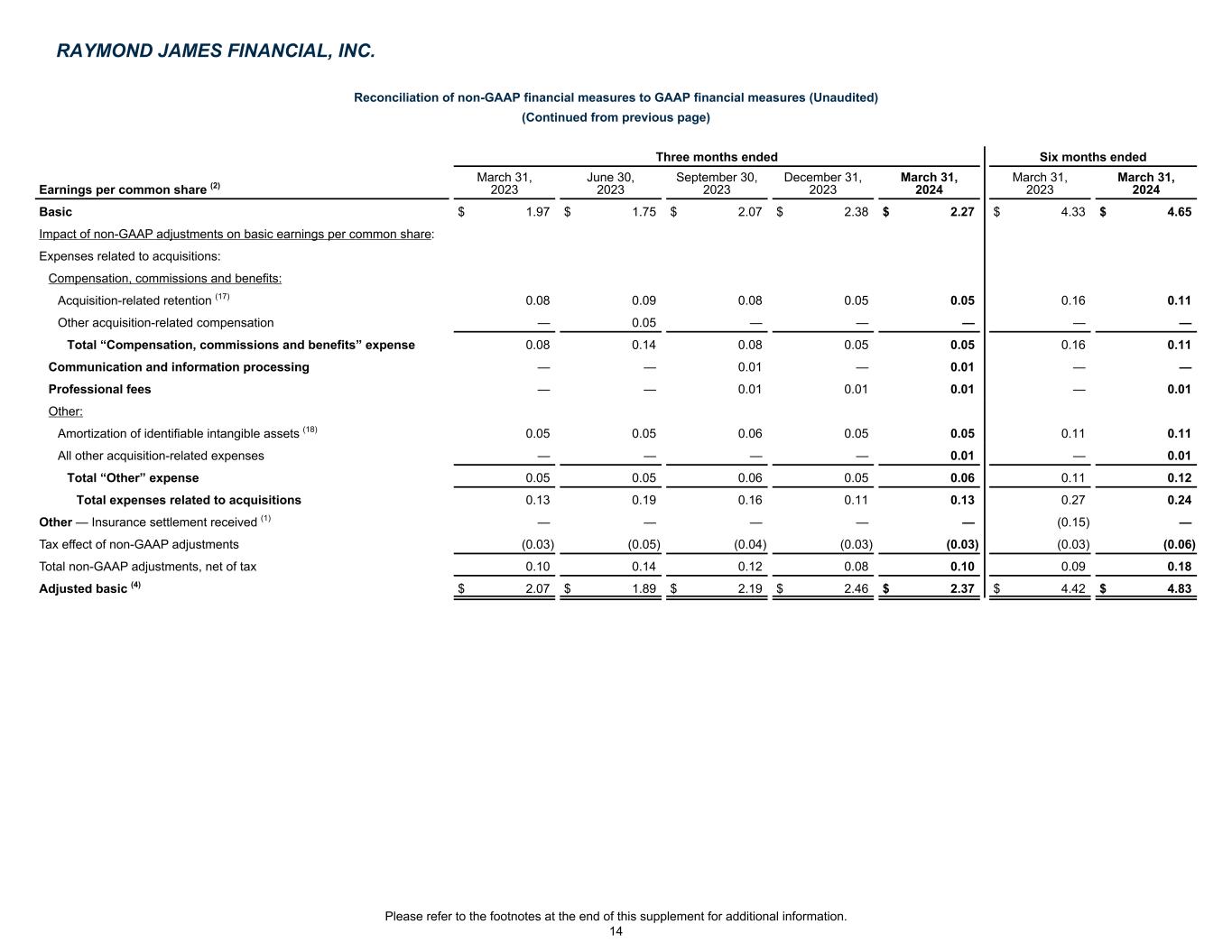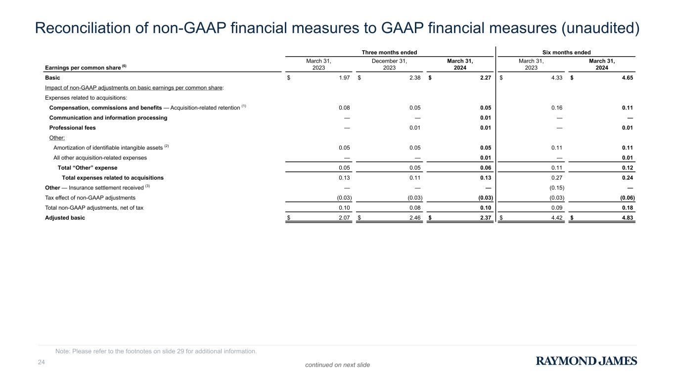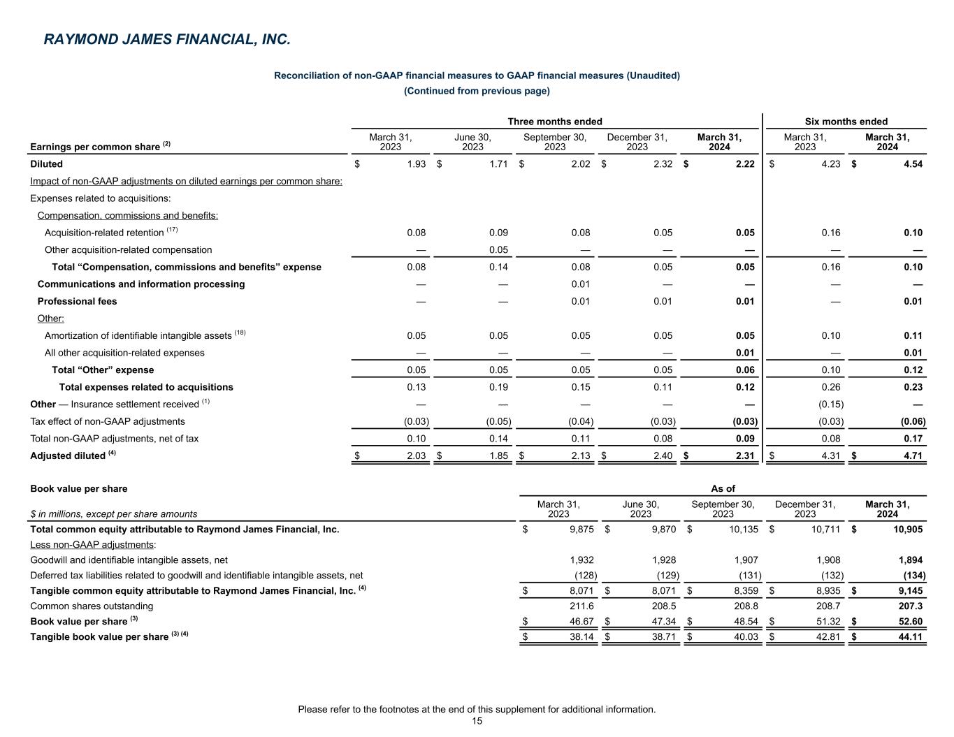 Reconciliation of non-GAAP financial measures to GAAP financial measures (Unaudited) (Continued from previous page) Three months ended Six months ended Earnings per common share (2) March 31, 2023 June 30, 2023 September 30, 2023 December 31, 2023 March 31, 2024 March 31, 2023 March 31, 2024 Basic $ 1.97 $ 1.75 $ 2.07 $ 2.38 $ 2.27 $ 4.33 $ 4.65 Impact of non-GAAP adjustments on basic earnings per common share: Expenses related to acquisitions: Compensation, commissions and benefits: Acquisition-related retention (17) 0.08 0.09 0.08 0.05 0.05 0.16 0.11 Other acquisition-related compensation — 0.05 — — — — — Total “Compensation, commissions and benefits” expense 0.08 0.14 0.08 0.05 0.05 0.16 0.11 Communication and information processing — — 0.01 — 0.01 — — Professional fees — — 0.01 0.01 0.01 — 0.01 Other: Amortization of identifiable intangible assets (18) 0.05 0.05 0.06 0.05 0.05 0.11 0.11 All other acquisition-related expenses — — — — 0.01 — 0.01 Total “Other” expense 0.05 0.05 0.06 0.05 0.06 0.11 0.12 Total expenses related to acquisitions 0.13 0.19 0.16 0.11 0.13 0.27 0.24 Other — Insurance settlement received (1) — — — — — (0.15) — Tax effect of non-GAAP adjustments (0.03) (0.05) (0.04) (0.03) (0.03) (0.03) (0.06) Total non-GAAP adjustments, net of tax 0.10 0.14 0.12 0.08 0.10 0.09 0.18 Adjusted basic (4) $ 2.07 $ 1.89 $ 2.19 $ 2.46 $ 2.37 $ 4.42 $ 4.83 RAYMOND JAMES FINANCIAL, INC. Please refer to the footnotes at the end of this supplement for additional information. 14
