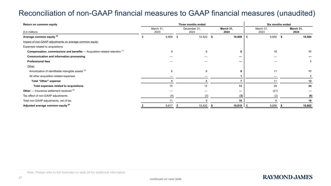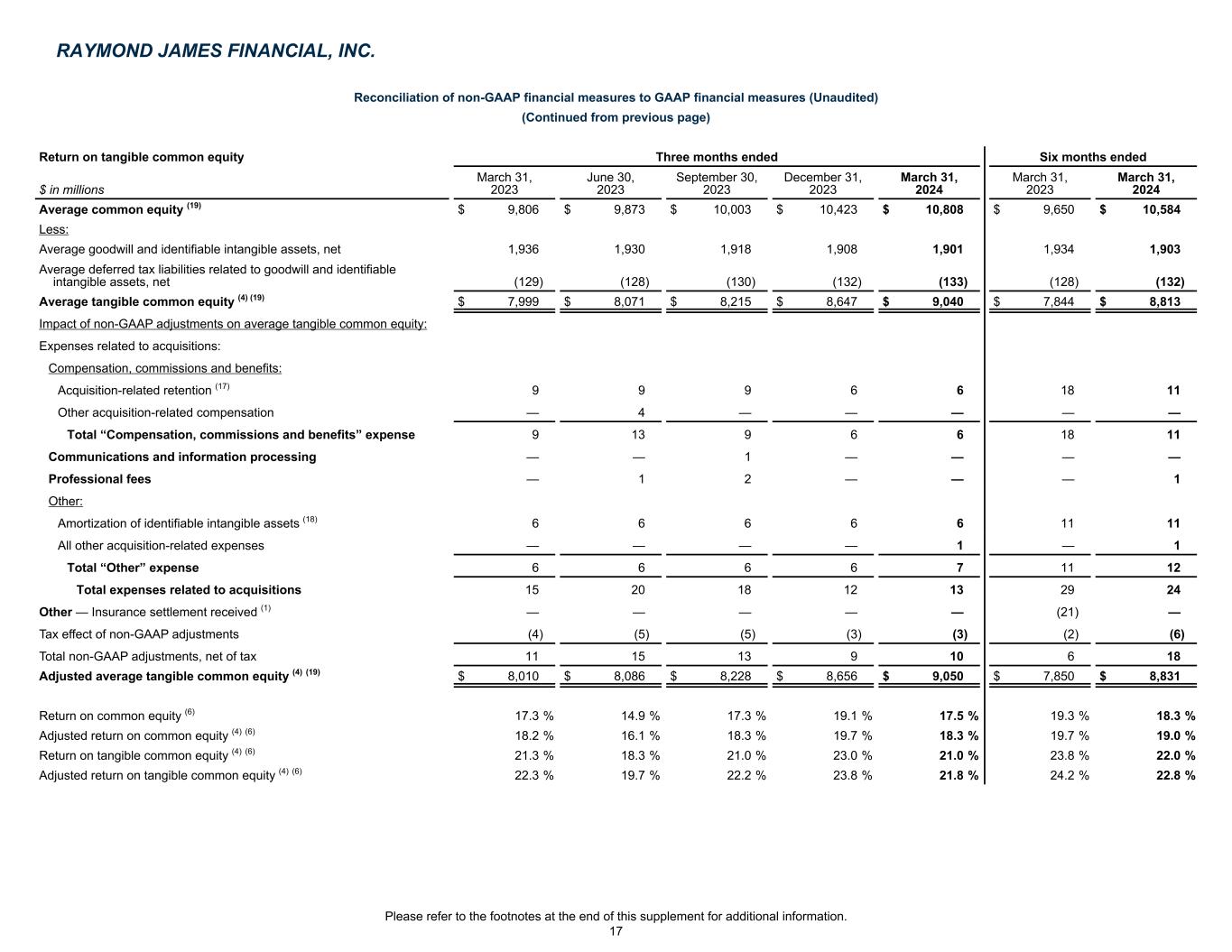 Reconciliation of non-GAAP financial measures to GAAP financial measures (Unaudited) (Continued from previous page) Return on common equity Three months ended Six months ended $ in millions March 31, 2023 June 30, 2023 September 30, 2023 December 31, 2023 March 31, 2024 March 31, 2023 March 31, 2024 Average common equity (19) $ 9,806 $ 9,873 $ 10,003 $ 10,423 $ 10,808 $ 9,650 $ 10,584 Impact of non-GAAP adjustments on average common equity: Expenses related to acquisitions: Compensation, commissions and benefits: Acquisition-related retention (17) 9 9 9 6 6 18 11 Other acquisition-related compensation — 4 — — — — — Total “Compensation, commissions and benefits” expense 9 13 9 6 6 18 11 Communications and information processing — — 1 — — — — Professional fees — 1 2 — — — 1 Other: Amortization of identifiable intangible assets (18) 6 6 6 6 6 11 11 All other acquisition-related expenses — — — — 1 — 1 Total “Other” expense 6 6 6 6 7 11 12 Total expenses related to acquisitions 15 20 18 12 13 29 24 Other — Insurance settlement received (1) — — — — — (21) — Tax effect of non-GAAP adjustments (4) (5) (5) (3) (3) (2) (6) Total non-GAAP adjustments, net of tax 11 15 13 9 10 6 18 Adjusted average common equity (4) (19) $ 9,817 $ 9,888 $ 10,016 $ 10,432 $ 10,818 $ 9,656 $ 10,602 RAYMOND JAMES FINANCIAL, INC. Please refer to the footnotes at the end of this supplement for additional information. 16