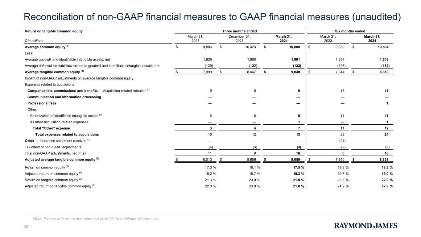 Reconciliation of non-GAAP financial measures to GAAP financial measures (unaudited) 27 Note: Please refer to the footnotes on slide 29 for additional information. Return on common equity Three months ended Six months ended $ in millions March 31, 2023 December 31, 2023 March 31, 2024 March 31, 2023 March 31, 2024 Average common equity (8) $ 9,806 $ 10,423 $ 10,808 $ 9,650 $ 10,584 Impact of non-GAAP adjustments on average common equity: Expenses related to acquisitions: Compensation, commissions and benefits — Acquisition-related retention (1) 9 6 6 18 11 Communication and information processing — — — — — Professional fees — — — — 1 Other: Amortization of identifiable intangible assets (2) 6 6 6 11 11 All other acquisition-related expenses — — 1 — 1 Total “Other” expense 6 6 7 11 12 Total expenses related to acquisitions 15 12 13 29 24 Other — Insurance settlement received (3) — — — (21) — Tax effect of non-GAAP adjustments (4) (3) (3) (2) (6) Total non-GAAP adjustments, net of tax 11 9 10 6 18 Adjusted average common equity (8) $ 9,817 $ 10,432 $ 10,818 $ 9,656 $ 10,602 continued on next slide
