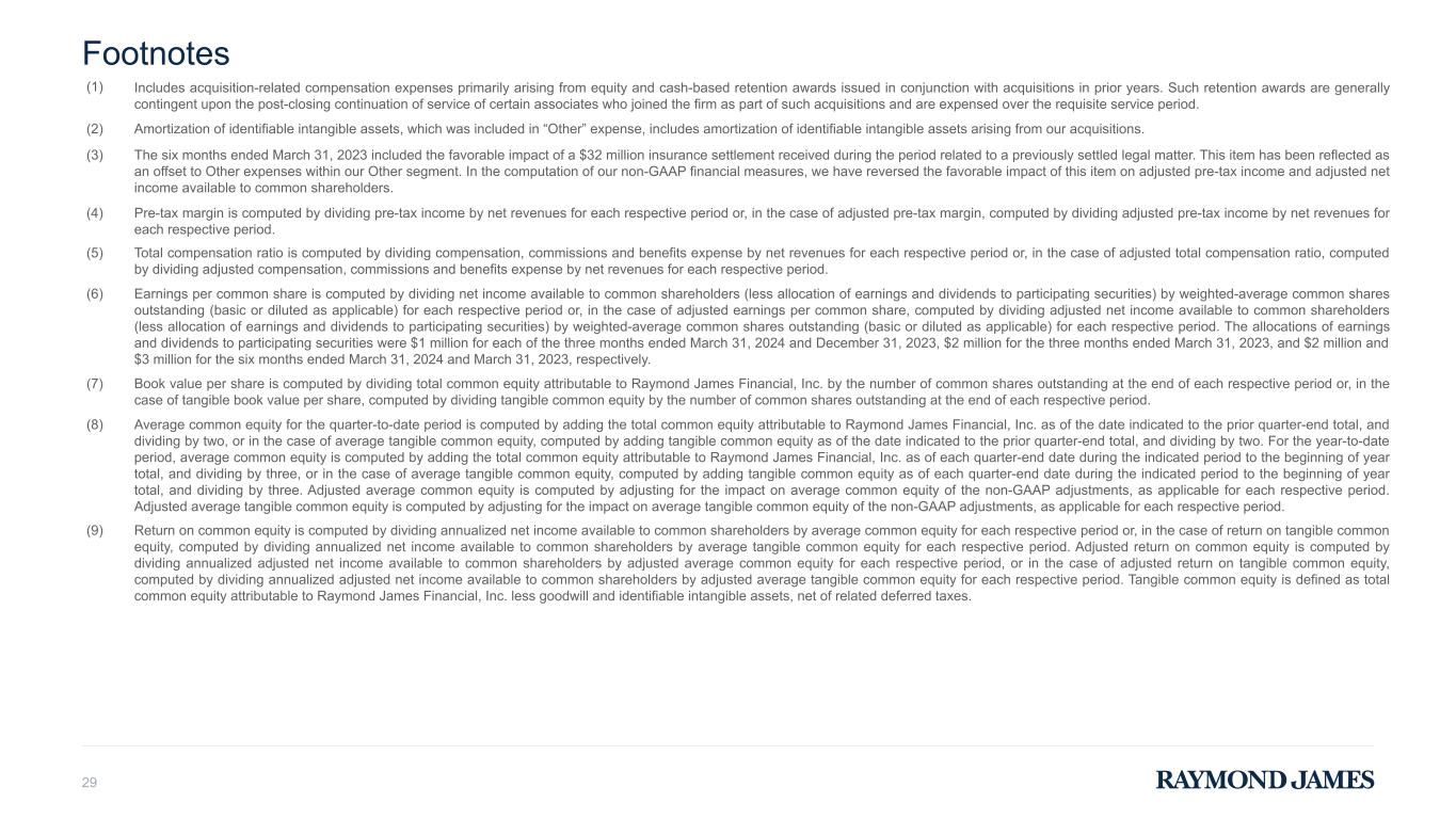 Footnotes 29 (1) Includes acquisition-related compensation expenses primarily arising from equity and cash-based retention awards issued in conjunction with acquisitions in prior years. Such retention awards are generally contingent upon the post-closing continuation of service of certain associates who joined the firm as part of such acquisitions and are expensed over the requisite service period. (2) Amortization of identifiable intangible assets, which was included in “Other” expense, includes amortization of identifiable intangible assets arising from our acquisitions. (3) The six months ended March 31, 2023 included the favorable impact of a $32 million insurance settlement received during the period related to a previously settled legal matter. This item has been reflected as an offset to Other expenses within our Other segment. In the computation of our non-GAAP financial measures, we have reversed the favorable impact of this item on adjusted pre-tax income and adjusted net income available to common shareholders. (4) Pre-tax margin is computed by dividing pre-tax income by net revenues for each respective period or, in the case of adjusted pre-tax margin, computed by dividing adjusted pre-tax income by net revenues for each respective period. (5) Total compensation ratio is computed by dividing compensation, commissions and benefits expense by net revenues for each respective period or, in the case of adjusted total compensation ratio, computed by dividing adjusted compensation, commissions and benefits expense by net revenues for each respective period. (6) Earnings per common share is computed by dividing net income available to common shareholders (less allocation of earnings and dividends to participating securities) by weighted-average common shares outstanding (basic or diluted as applicable) for each respective period or, in the case of adjusted earnings per common share, computed by dividing adjusted net income available to common shareholders (less allocation of earnings and dividends to participating securities) by weighted-average common shares outstanding (basic or diluted as applicable) for each respective period. The allocations of earnings and dividends to participating securities were $1 million for each of the three months ended March 31, 2024 and December 31, 2023, $2 million for the three months ended March 31, 2023, and $2 million and $3 million for the six months ended March 31, 2024 and March 31, 2023, respectively. (7) Book value per share is computed by dividing total common equity attributable to Raymond James Financial, Inc. by the number of common shares outstanding at the end of each respective period or, in the case of tangible book value per share, computed by dividing tangible common equity by the number of common shares outstanding at the end of each respective period. (8) Average common equity for the quarter-to-date period is computed by adding the total common equity attributable to Raymond James Financial, Inc. as of the date indicated to the prior quarter-end total, and dividing by two, or in the case of average tangible common equity, computed by adding tangible common equity as of the date indicated to the prior quarter-end total, and dividing by two. For the year-to-date period, average common equity is computed by adding the total common equity attributable to Raymond James Financial, Inc. as of each quarter-end date during the indicated period to the beginning of year total, and dividing by three, or in the case of average tangible common equity, computed by adding tangible common equity as of each quarter-end date during the indicated period to the beginning of year total, and dividing by three. Adjusted average common equity is computed by adjusting for the impact on average common equity of the non-GAAP adjustments, as applicable for each respective period. Adjusted average tangible common equity is computed by adjusting for the impact on average tangible common equity of the non-GAAP adjustments, as applicable for each respective period. (9) Return on common equity is computed by dividing annualized net income available to common shareholders by average common equity for each respective period or, in the case of return on tangible common equity, computed by dividing annualized net income available to common shareholders by average tangible common equity for each respective period. Adjusted return on common equity is computed by dividing annualized adjusted net income available to common shareholders by adjusted average common equity for each respective period, or in the case of adjusted return on tangible common equity, computed by dividing annualized adjusted net income available to common shareholders by adjusted average tangible common equity for each respective period. Tangible common equity is defined as total common equity attributable to Raymond James Financial, Inc. less goodwill and identifiable intangible assets, net of related deferred taxes.
