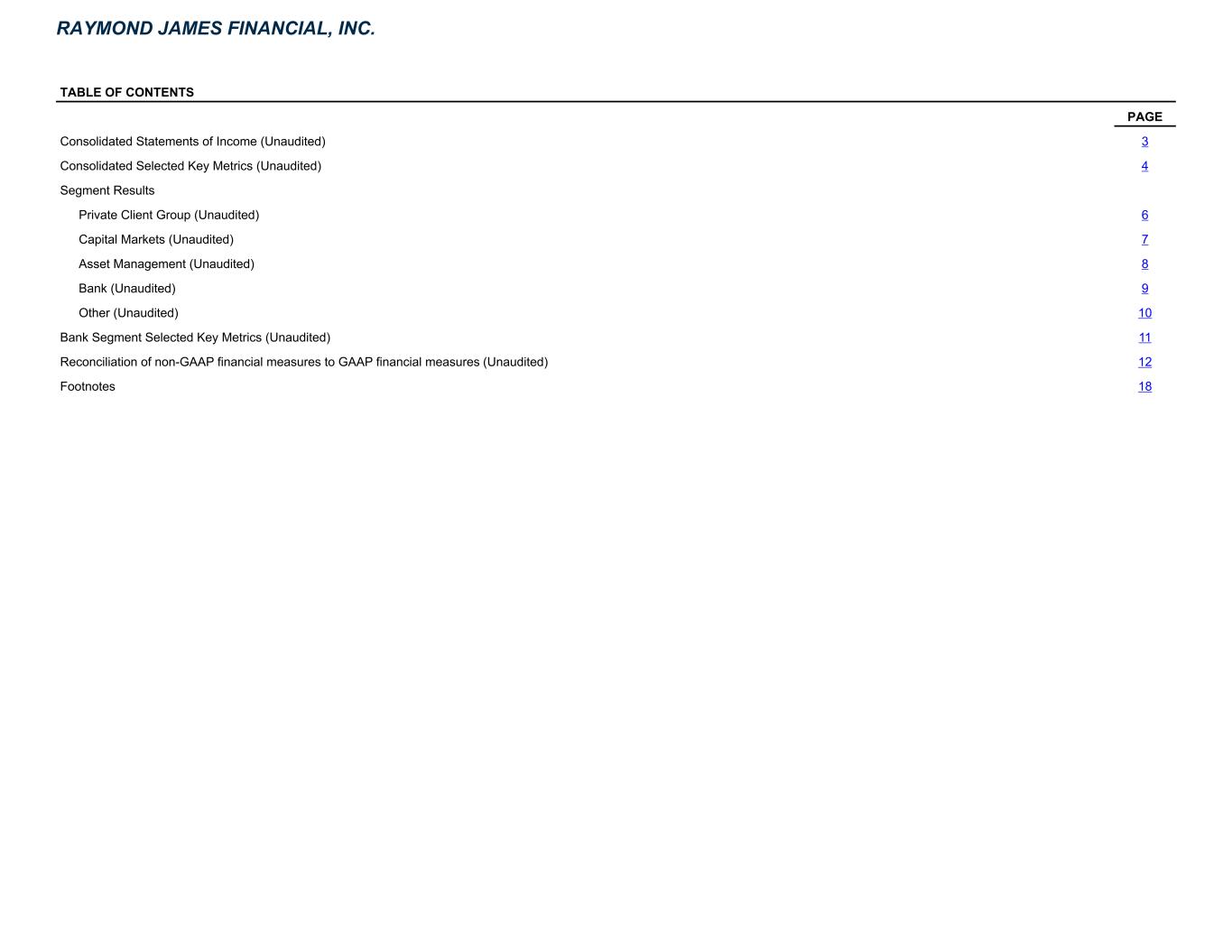 TABLE OF CONTENTS PAGE Consolidated Statements of Income (Unaudited) 3 Consolidated Selected Key Metrics (Unaudited) 4 Segment Results Private Client Group (Unaudited) 6 Capital Markets (Unaudited) 7 Asset Management (Unaudited) 8 Bank (Unaudited) 9 Other (Unaudited) 10 Bank Segment Selected Key Metrics (Unaudited) 11 Reconciliation of non-GAAP financial measures to GAAP financial measures (Unaudited) 12 Footnotes 18 RAYMOND JAMES FINANCIAL, INC.
