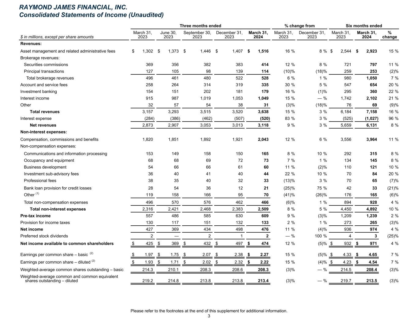 Three months ended % change from Six months ended $ in millions, except per share amounts March 31, 2023 June 30, 2023 September 30, 2023 December 31, 2023 March 31, 2024 March 31, 2023 December 31, 2023 March 31, 2023 March 31, 2024 % change Revenues: Asset management and related administrative fees $ 1,302 $ 1,373 $ 1,446 $ 1,407 $ 1,516 16 % 8 % $ 2,544 $ 2,923 15 % Brokerage revenues: Securities commissions 369 356 382 383 414 12 % 8 % 721 797 11 % Principal transactions 127 105 98 139 114 (10) % (18) % 259 253 (2) % Total brokerage revenues 496 461 480 522 528 6 % 1 % 980 1,050 7 % Account and service fees 258 264 314 319 335 30 % 5 % 547 654 20 % Investment banking 154 151 202 181 179 16 % (1) % 295 360 22 % Interest income 915 987 1,019 1,053 1,049 15 % — % 1,742 2,102 21 % Other 32 57 54 38 31 (3) % (18) % 76 69 (9) % Total revenues 3,157 3,293 3,515 3,520 3,638 15 % 3 % 6,184 7,158 16 % Interest expense (284) (386) (462) (507) (520) 83 % 3 % (525) (1,027) 96 % Net revenues 2,873 2,907 3,053 3,013 3,118 9 % 3 % 5,659 6,131 8 % Non-interest expenses: Compensation, commissions and benefits 1,820 1,851 1,892 1,921 2,043 12 % 6 % 3,556 3,964 11 % Non-compensation expenses: Communications and information processing 153 149 158 150 165 8 % 10 % 292 315 8 % Occupancy and equipment 68 68 69 72 73 7 % 1 % 134 145 8 % Business development 54 66 66 61 60 11 % (2) % 110 121 10 % Investment sub-advisory fees 36 40 41 40 44 22 % 10 % 70 84 20 % Professional fees 38 35 40 32 33 (13) % 3 % 70 65 (7) % Bank loan provision for credit losses 28 54 36 12 21 (25) % 75 % 42 33 (21) % Other (1) 119 158 166 95 70 (41) % (26) % 176 165 (6) % Total non-compensation expenses 496 570 576 462 466 (6) % 1 % 894 928 4 % Total non-interest expenses 2,316 2,421 2,468 2,383 2,509 8 % 5 % 4,450 4,892 10 % Pre-tax income 557 486 585 630 609 9 % (3) % 1,209 1,239 2 % Provision for income taxes 130 117 151 132 133 2 % 1 % 273 265 (3) % Net income 427 369 434 498 476 11 % (4) % 936 974 4 % Preferred stock dividends 2 — 2 1 2 — % 100 % 4 3 (25) % Net income available to common shareholders $ 425 $ 369 $ 432 $ 497 $ 474 12 % (5) % $ 932 $ 971 4 % Earnings per common share – basic (2) $ 1.97 $ 1.75 $ 2.07 $ 2.38 $ 2.27 15 % (5) % $ 4.33 $ 4.65 7 % Earnings per common share – diluted (2) $ 1.93 $ 1.71 $ 2.02 $ 2.32 $ 2.22 15 % (4) % $ 4.23 $ 4.54 7 % Weighted-average common shares outstanding – basic 214.3 210.1 208.3 208.6 208.3 (3) % — % 214.5 208.4 (3) % Weighted-average common and common equivalent shares outstanding – diluted 219.2 214.8 213.8 213.8 213.4 (3) % — % 219.7 213.5 (3) % RAYMOND JAMES FINANCIAL, INC. Consolidated Statements of Income (Unaudited) Please refer to the footnotes at the end of this supplement for additional information. 3