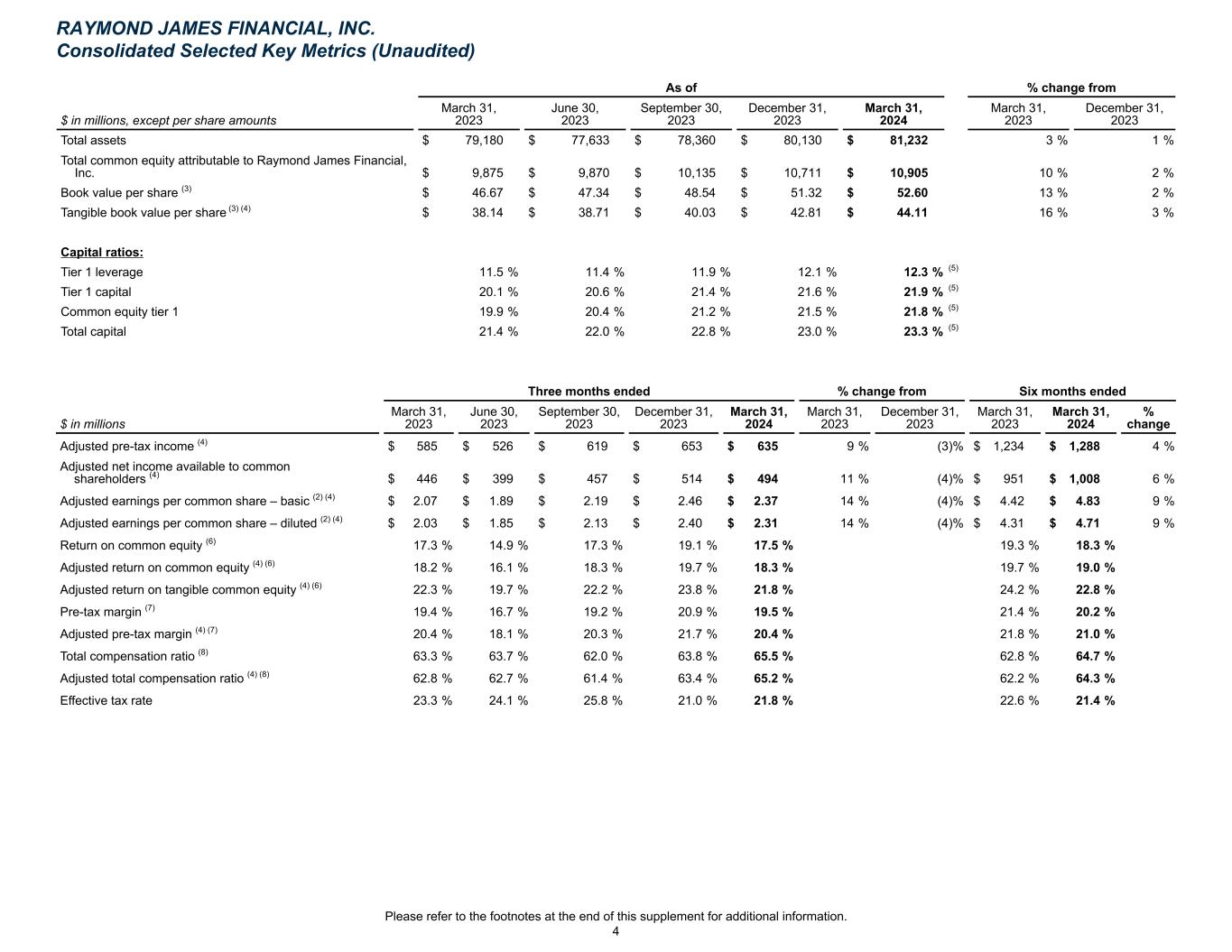 As of % change from $ in millions, except per share amounts March 31, 2023 June 30, 2023 September 30, 2023 December 31, 2023 March 31, 2024 March 31, 2023 December 31, 2023 Total assets $ 79,180 $ 77,633 $ 78,360 $ 80,130 $ 81,232 3 % 1 % Total common equity attributable to Raymond James Financial, Inc. $ 9,875 $ 9,870 $ 10,135 $ 10,711 $ 10,905 10 % 2 % Book value per share (3) $ 46.67 $ 47.34 $ 48.54 $ 51.32 $ 52.60 13 % 2 % Tangible book value per share (3) (4) $ 38.14 $ 38.71 $ 40.03 $ 42.81 $ 44.11 16 % 3 % Capital ratios: Tier 1 leverage 11.5 % 11.4 % 11.9 % 12.1 % 12.3 % (5) Tier 1 capital 20.1 % 20.6 % 21.4 % 21.6 % 21.9 % (5) Common equity tier 1 19.9 % 20.4 % 21.2 % 21.5 % 21.8 % (5) Total capital 21.4 % 22.0 % 22.8 % 23.0 % 23.3 % (5) $ in millions March 31, 2023 June 30, 2023 September 30, 2023 December 31, 2023 March 31, 2024 March 31, 2023 December 31, 2023 March 31, 2023 March 31, 2024 % change Adjusted pre-tax income (4) $ 585 $ 526 $ 619 $ 653 $ 635 9 % (3) % $ 1,234 $ 1,288 4 % Adjusted net income available to common shareholders (4) $ 446 $ 399 $ 457 $ 514 $ 494 11 % (4) % $ 951 $ 1,008 6 % Adjusted earnings per common share – basic (2) (4) $ 2.07 $ 1.89 $ 2.19 $ 2.46 $ 2.37 14 % (4) % $ 4.42 $ 4.83 9 % Adjusted earnings per common share – diluted (2) (4) $ 2.03 $ 1.85 $ 2.13 $ 2.40 $ 2.31 14 % (4) % $ 4.31 $ 4.71 9 % Return on common equity (6) 17.3 % 14.9 % 17.3 % 19.1 % 17.5 % 19.3 % 18.3 % Adjusted return on common equity (4) (6) 18.2 % 16.1 % 18.3 % 19.7 % 18.3 % 19.7 % 19.0 % Adjusted return on tangible common equity (4) (6) 22.3 % 19.7 % 22.2 % 23.8 % 21.8 % 24.2 % 22.8 % Pre-tax margin (7) 19.4 % 16.7 % 19.2 % 20.9 % 19.5 % 21.4 % 20.2 % Adjusted pre-tax margin (4) (7) 20.4 % 18.1 % 20.3 % 21.7 % 20.4 % 21.8 % 21.0 % Total compensation ratio (8) 63.3 % 63.7 % 62.0 % 63.8 % 65.5 % 62.8 % 64.7 % Adjusted total compensation ratio (4) (8) 62.8 % 62.7 % 61.4 % 63.4 % 65.2 % 62.2 % 64.3 % Effective tax rate 23.3 % 24.1 % 25.8 % 21.0 % 21.8 % 22.6 % 21.4 % Three months ended % change from Six months ended RAYMOND JAMES FINANCIAL, INC. Consolidated Selected Key Metrics (Unaudited) Please refer to the footnotes at the end of this supplement for additional information. 4