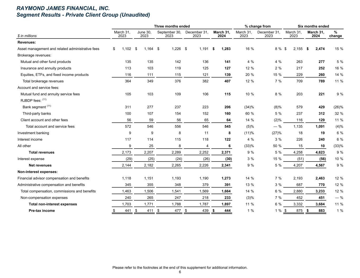 Three months ended % change from Six months ended $ in millions March 31, 2023 June 30, 2023 September 30, 2023 December 31, 2023 March 31, 2024 March 31, 2023 December 31, 2023 March 31, 2023 March 31, 2024 % change Revenues: Asset management and related administrative fees $ 1,102 $ 1,164 $ 1,226 $ 1,191 $ 1,283 16 % 8 % $ 2,155 $ 2,474 15 % Brokerage revenues: Mutual and other fund products 135 135 142 136 141 4 % 4 % 263 277 5 % Insurance and annuity products 113 103 119 125 127 12 % 2 % 217 252 16 % Equities, ETFs, and fixed income products 116 111 115 121 139 20 % 15 % 229 260 14 % Total brokerage revenues 364 349 376 382 407 12 % 7 % 709 789 11 % Account and service fees: Mutual fund and annuity service fees 105 103 109 106 115 10 % 8 % 203 221 9 % RJBDP fees: (11) Bank segment (11) 311 277 237 223 206 (34) % (8) % 579 429 (26) % Third-party banks 100 107 154 152 160 60 % 5 % 237 312 32 % Client account and other fees 56 59 56 65 64 14 % (2) % 116 129 11 % Total account and service fees 572 546 556 546 545 (5) % — % 1,135 1,091 (4) % Investment banking 9 9 8 11 8 (11) % (27) % 18 19 6 % Interest income 117 114 115 118 122 4 % 3 % 226 240 6 % All other 9 25 8 4 6 (33) % 50 % 15 10 (33) % Total revenues 2,173 2,207 2,289 2,252 2,371 9 % 5 % 4,258 4,623 9 % Interest expense (29) (25) (24) (26) (30) 3 % 15 % (51) (56) 10 % Net revenues 2,144 2,182 2,265 2,226 2,341 9 % 5 % 4,207 4,567 9 % Non-interest expenses: Financial advisor compensation and benefits 1,118 1,151 1,193 1,190 1,273 14 % 7 % 2,193 2,463 12 % Administrative compensation and benefits 345 355 348 379 391 13 % 3 % 687 770 12 % Total compensation, commissions and benefits 1,463 1,506 1,541 1,569 1,664 14 % 6 % 2,880 3,233 12 % Non-compensation expenses 240 265 247 218 233 (3) % 7 % 452 451 — % Total non-interest expenses 1,703 1,771 1,788 1,787 1,897 11 % 6 % 3,332 3,684 11 % Pre-tax income $ 441 $ 411 $ 477 $ 439 $ 444 1 % 1 % $ 875 $ 883 1 % RAYMOND JAMES FINANCIAL, INC. Segment Results - Private Client Group (Unaudited) Please refer to the footnotes at the end of this supplement for additional information. 6