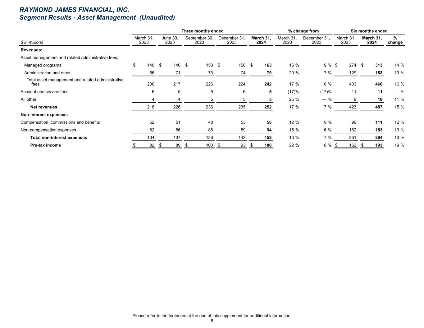 Three months ended % change from Six months ended $ in millions March 31, 2023 June 30, 2023 September 30, 2023 December 31, 2023 March 31, 2024 March 31, 2023 December 31, 2023 March 31, 2023 March 31, 2024 % change Revenues: Asset management and related administrative fees: Managed programs $ 140 $ 146 $ 153 $ 150 $ 163 16 % 9 % $ 274 $ 313 14 % Administration and other 66 71 73 74 79 20 % 7 % 129 153 19 % Total asset management and related administrative fees 206 217 226 224 242 17 % 8 % 403 466 16 % Account and service fees 6 5 5 6 5 (17) % (17) % 11 11 — % All other 4 4 5 5 5 25 % — % 9 10 11 % Net revenues 216 226 236 235 252 17 % 7 % 423 487 15 % Non-interest expenses: Compensation, commissions and benefits 52 51 48 53 58 12 % 9 % 99 111 12 % Non-compensation expenses 82 86 88 89 94 15 % 6 % 162 183 13 % Total non-interest expenses 134 137 136 142 152 13 % 7 % 261 294 13 % Pre-tax income $ 82 $ 89 $ 100 $ 93 $ 100 22 % 8 % $ 162 $ 193 19 % RAYMOND JAMES FINANCIAL, INC. Segment Results - Asset Management (Unaudited) Please refer to the footnotes at the end of this supplement for additional information. 8