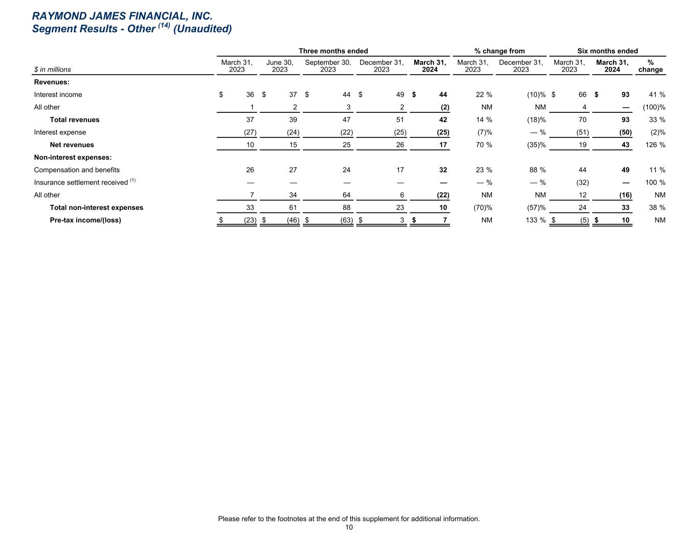 Three months ended % change from Six months ended $ in millions March 31, 2023 June 30, 2023 September 30, 2023 December 31, 2023 March 31, 2024 March 31, 2023 December 31, 2023 March 31, 2023 March 31, 2024 % change Revenues: Interest income $ 36 $ 37 $ 44 $ 49 $ 44 22 % (10) % $ 66 $ 93 41 % All other 1 2 3 2 (2) NM NM 4 — (100) % Total revenues 37 39 47 51 42 14 % (18) % 70 93 33 % Interest expense (27) (24) (22) (25) (25) (7) % — % (51) (50) (2) % Net revenues 10 15 25 26 17 70 % (35) % 19 43 126 % Non-interest expenses: Compensation and benefits 26 27 24 17 32 23 % 88 % 44 49 11 % Insurance settlement received (1) — — — — — — % — % (32) — 100 % All other 7 34 64 6 (22) NM NM 12 (16) NM Total non-interest expenses 33 61 88 23 10 (70) % (57) % 24 33 38 % Pre-tax income/(loss) $ (23) $ (46) $ (63) $ 3 $ 7 NM 133 % $ (5) $ 10 NM RAYMOND JAMES FINANCIAL, INC. Segment Results - Other (14) (Unaudited) Please refer to the footnotes at the end of this supplement for additional information. 10