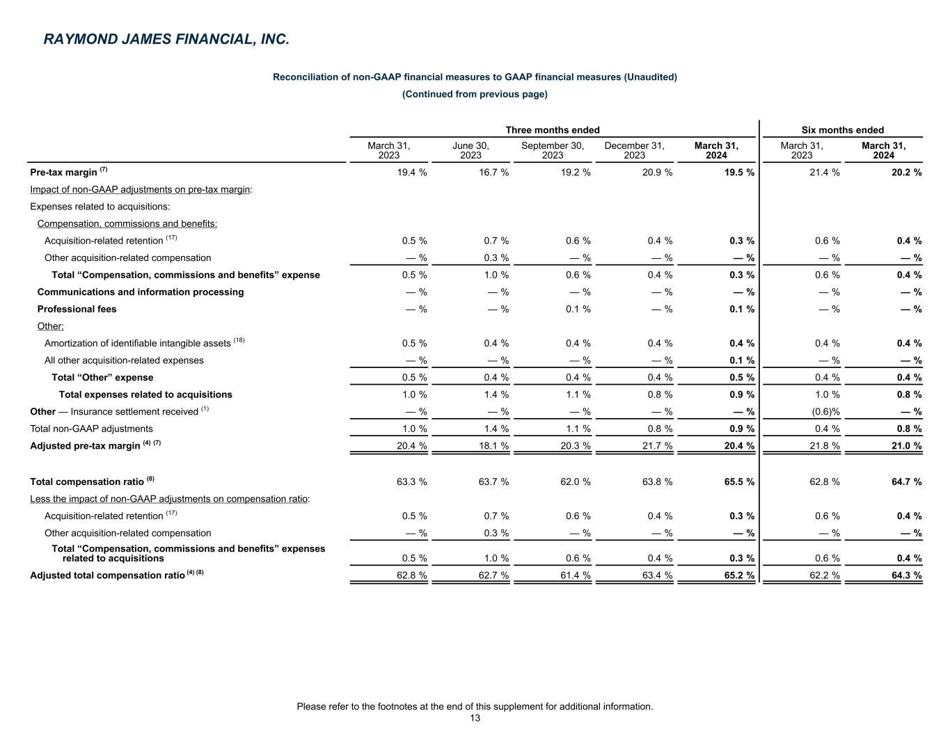 Reconciliation of non-GAAP financial measures to GAAP financial measures (Unaudited) (Continued from previous page) Three months ended Six months ended March 31, 2023 June 30, 2023 September 30, 2023 December 31, 2023 March 31, 2024 March 31, 2023 March 31, 2024 Pre-tax margin (7) 19.4 % 16.7 % 19.2 % 20.9 % 19.5 % 21.4 % 20.2 % Impact of non-GAAP adjustments on pre-tax margin: Expenses related to acquisitions: Compensation, commissions and benefits: Acquisition-related retention (17) 0.5 % 0.7 % 0.6 % 0.4 % 0.3 % 0.6 % 0.4 % Other acquisition-related compensation — % 0.3 % — % — % — % — % — % Total “Compensation, commissions and benefits” expense 0.5 % 1.0 % 0.6 % 0.4 % 0.3 % 0.6 % 0.4 % Communications and information processing — % — % — % — % — % — % — % Professional fees — % — % 0.1 % — % 0.1 % — % — % Other: Amortization of identifiable intangible assets (18) 0.5 % 0.4 % 0.4 % 0.4 % 0.4 % 0.4 % 0.4 % All other acquisition-related expenses — % — % — % — % 0.1 % — % — % Total “Other” expense 0.5 % 0.4 % 0.4 % 0.4 % 0.5 % 0.4 % 0.4 % Total expenses related to acquisitions 1.0 % 1.4 % 1.1 % 0.8 % 0.9 % 1.0 % 0.8 % Other — Insurance settlement received (1) — % — % — % — % — % (0.6) % — % Total non-GAAP adjustments 1.0 % 1.4 % 1.1 % 0.8 % 0.9 % 0.4 % 0.8 % Adjusted pre-tax margin (4) (7) 20.4 % 18.1 % 20.3 % 21.7 % 20.4 % 21.8 % 21.0 % Total compensation ratio (8) 63.3 % 63.7 % 62.0 % 63.8 % 65.5 % 62.8 % 64.7 % Less the impact of non-GAAP adjustments on compensation ratio: Acquisition-related retention (17) 0.5 % 0.7 % 0.6 % 0.4 % 0.3 % 0.6 % 0.4 % Other acquisition-related compensation — % 0.3 % — % — % — % — % — % Total “Compensation, commissions and benefits” expenses related to acquisitions 0.5 % 1.0 % 0.6 % 0.4 % 0.3 % 0.6 % 0.4 % Adjusted total compensation ratio (4) (8) 62.8 % 62.7 % 61.4 % 63.4 % 65.2 % 62.2 % 64.3 % RAYMOND JAMES FINANCIAL, INC. Please refer to the footnotes at the end of this supplement for additional information. 13