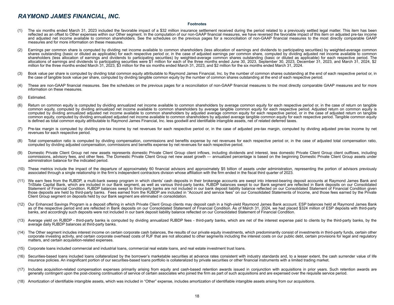 Reconciliation of non-GAAP financial measures to GAAP financial measures (Unaudited) (Continued from previous page) Return on tangible common equity Three months ended Six months ended $ in millions March 31, 2023 June 30, 2023 September 30, 2023 December 31, 2023 March 31, 2024 March 31, 2023 March 31, 2024 Average common equity (19) $ 9,806 $ 9,873 $ 10,003 $ 10,423 $ 10,808 $ 9,650 $ 10,584 Less: Average goodwill and identifiable intangible assets, net 1,936 1,930 1,918 1,908 1,901 1,934 1,903 Average deferred tax liabilities related to goodwill and identifiable intangible assets, net (129) (128) (130) (132) (133) (128) (132) Average tangible common equity (4) (19) $ 7,999 $ 8,071 $ 8,215 $ 8,647 $ 9,040 $ 7,844 $ 8,813 Impact of non-GAAP adjustments on average tangible common equity: Expenses related to acquisitions: Compensation, commissions and benefits: Acquisition-related retention (17) 9 9 9 6 6 18 11 Other acquisition-related compensation — 4 — — — — — Total “Compensation, commissions and benefits” expense 9 13 9 6 6 18 11 Communications and information processing — — 1 — — — — Professional fees — 1 2 — — — 1 Other: Amortization of identifiable intangible assets (18) 6 6 6 6 6 11 11 All other acquisition-related expenses — — — — 1 — 1 Total “Other” expense 6 6 6 6 7 11 12 Total expenses related to acquisitions 15 20 18 12 13 29 24 Other — Insurance settlement received (1) — — — — — (21) — Tax effect of non-GAAP adjustments (4) (5) (5) (3) (3) (2) (6) Total non-GAAP adjustments, net of tax 11 15 13 9 10 6 18 Adjusted average tangible common equity (4) (19) $ 8,010 $ 8,086 $ 8,228 $ 8,656 $ 9,050 $ 7,850 $ 8,831 Return on common equity (6) 17.3 % 14.9 % 17.3 % 19.1 % 17.5 % 19.3 % 18.3 % Adjusted return on common equity (4) (6) 18.2 % 16.1 % 18.3 % 19.7 % 18.3 % 19.7 % 19.0 % Return on tangible common equity (4) (6) 21.3 % 18.3 % 21.0 % 23.0 % 21.0 % 23.8 % 22.0 % Adjusted return on tangible common equity (4) (6) 22.3 % 19.7 % 22.2 % 23.8 % 21.8 % 24.2 % 22.8 % RAYMOND JAMES FINANCIAL, INC. Please refer to the footnotes at the end of this supplement for additional information. 17