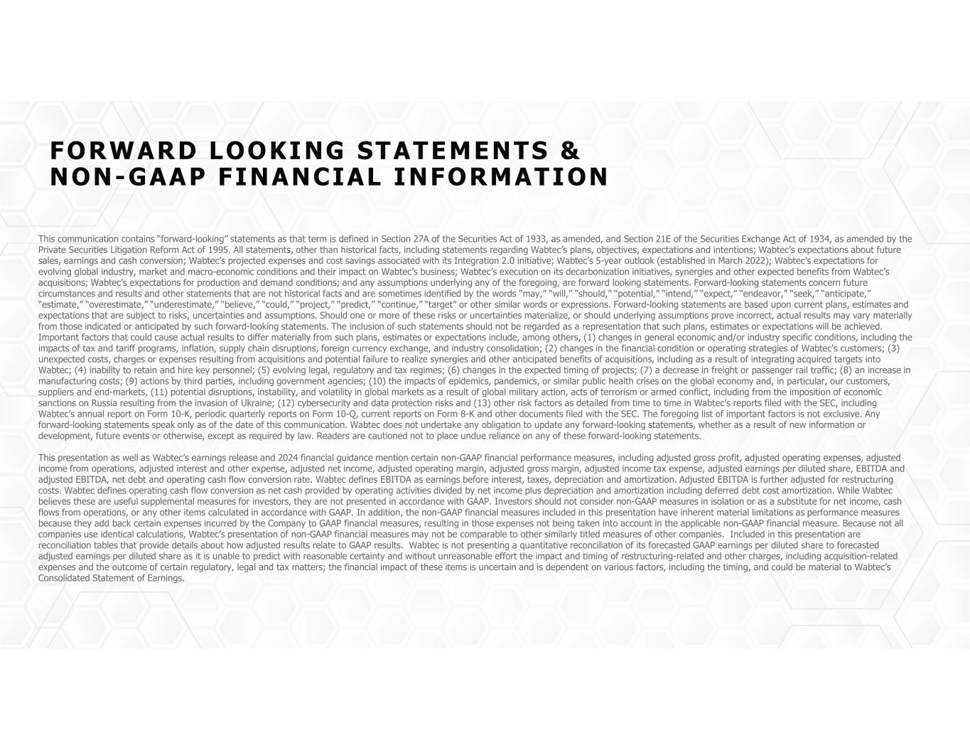 FORWARD LOOKING STATEMENTS & NON-GAAP FINANCIAL INFORMATION This communication contains “forward-looking” statements as that term is defined in Section 27A of the Securities Act of 1933, as amended, and Section 21E of the Securities Exchange Act of 1934, as amended by the Private Securities Litigation Reform Act of 1995. All statements, other than historical facts, including statements regarding Wabtec’s plans, objectives, expectations and intentions; Wabtec’s expectations about future sales, earnings and cash conversion; Wabtec’s projected expenses and cost savings associated with its Integration 2.0 initiative; Wabtec’s 5-year outlook (established in March 2022); Wabtec’s expectations for evolving global industry, market and macro-economic conditions and their impact on Wabtec’s business; Wabtec’s execution on its decarbonization initiatives, synergies and other expected benefits from Wabtec’s acquisitions; Wabtec’s expectations for production and demand conditions; and any assumptions underlying any of the foregoing, are forward looking statements. Forward-looking statements concern future circumstances and results and other statements that are not historical facts and are sometimes identified by the words “may,” “will,” “should,” “potential,” “intend,” “expect,” “endeavor,” “seek,” “anticipate,” “estimate,” “overestimate,” “underestimate,” “believe,” “could,” “project,” “predict,” “continue,” “target” or other similar words or expressions. Forward-looking statements are based upon current plans, estimates and expectations that are subject to risks, uncertainties and assumptions. Should one or more of these risks or uncertainties materialize, or should underlying assumptions prove incorrect, actual results may vary materially from those indicated or anticipated by such forward-looking statements. The inclusion of such statements should not be regarded as a representation that such plans, estimates or expectations will be achieved. Important factors that could cause actual results to differ materially from such plans, estimates or expectations include, among others, (1) changes in general economic and/or industry specific conditions, including the impacts of tax and tariff programs, inflation, supply chain disruptions, foreign currency exchange, and industry consolidation; (2) changes in the financial condition or operating strategies of Wabtec's customers; (3) unexpected costs, charges or expenses resulting from acquisitions and potential failure to realize synergies and other anticipated benefits of acquisitions, including as a result of integrating acquired targets into Wabtec; (4) inability to retain and hire key personnel; (5) evolving legal, regulatory and tax regimes; (6) changes in the expected timing of projects; (7) a decrease in freight or passenger rail traffic; (8) an increase in manufacturing costs; (9) actions by third parties, including government agencies; (10) the impacts of epidemics, pandemics, or similar public health crises on the global economy and, in particular, our customers, suppliers and end-markets, (11) potential disruptions, instability, and volatility in global markets as a result of global military action, acts of terrorism or armed conflict, including from the imposition of economic sanctions on Russia resulting from the invasion of Ukraine; (12) cybersecurity and data protection risks and (13) other risk factors as detailed from time to time in Wabtec’s reports filed with the SEC, including Wabtec’s annual report on Form 10-K, periodic quarterly reports on Form 10-Q, current reports on Form 8-K and other documents filed with the SEC. The foregoing list of important factors is not exclusive. Any forward-looking statements speak only as of the date of this communication. Wabtec does not undertake any obligation to update any forward-looking statements, whether as a result of new information or development, future events or otherwise, except as required by law. Readers are cautioned not to place undue reliance on any of these forward-looking statements. This presentation as well as Wabtec’s earnings release and 2024 financial guidance mention certain non-GAAP financial performance measures, including adjusted gross profit, adjusted operating expenses, adjusted income from operations, adjusted interest and other expense, adjusted net income, adjusted operating margin, adjusted gross margin, adjusted income tax expense, adjusted earnings per diluted share, EBITDA and adjusted EBITDA, net debt and operating cash flow conversion rate. Wabtec defines EBITDA as earnings before interest, taxes, depreciation and amortization. Adjusted EBITDA is further adjusted for restructuring costs. Wabtec defines operating cash flow conversion as net cash provided by operating activities divided by net income plus depreciation and amortization including deferred debt cost amortization. While Wabtec believes these are useful supplemental measures for investors, they are not presented in accordance with GAAP. Investors should not consider non-GAAP measures in isolation or as a substitute for net income, cash flows from operations, or any other items calculated in accordance with GAAP. In addition, the non-GAAP financial measures included in this presentation have inherent material limitations as performance measures because they add back certain expenses incurred by the Company to GAAP financial measures, resulting in those expenses not being taken into account in the applicable non-GAAP financial measure. Because not all companies use identical calculations, Wabtec’s presentation of non-GAAP financial measures may not be comparable to other similarly titled measures of other companies. Included in this presentation are reconciliation tables that provide details about how adjusted results relate to GAAP results. Wabtec is not presenting a quantitative reconciliation of its for