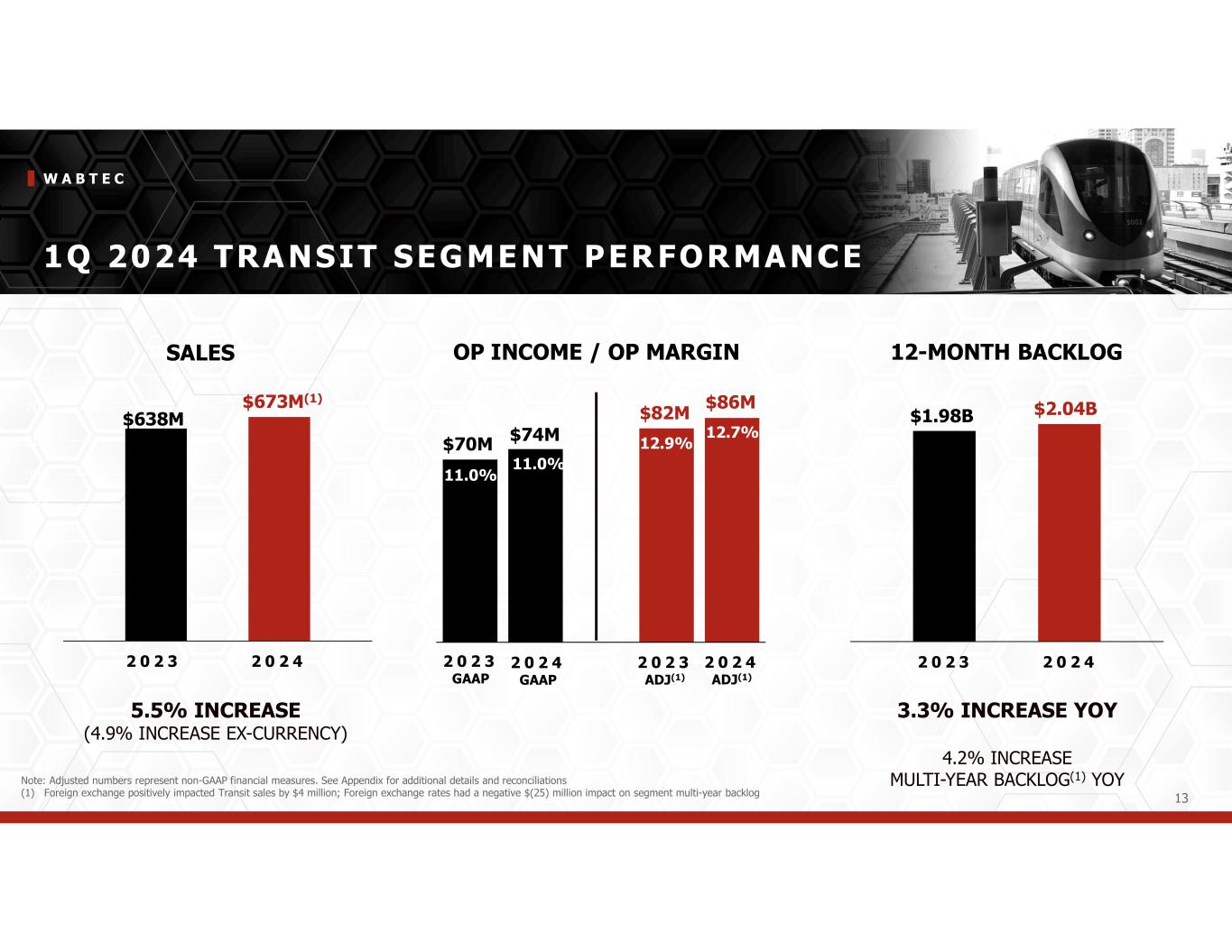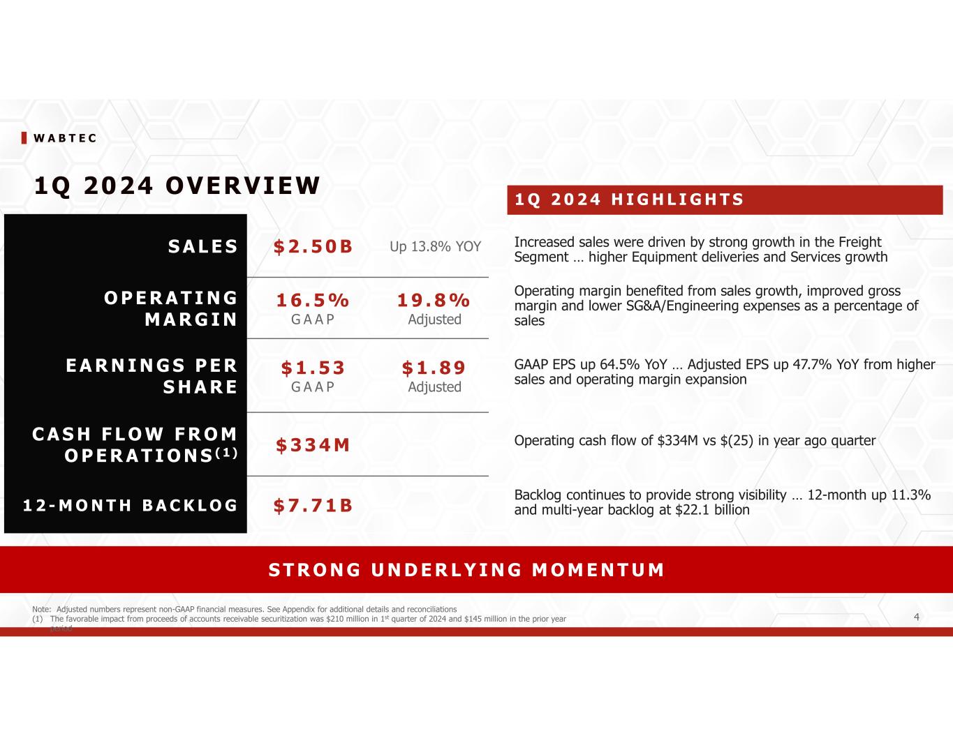 W A B T E C 4 1Q 2024 OVERVIEW S A L E S $ 2 . 5 0 B Up 13.8% YOY O P E R A T I N G M A R G I N 1 6 . 5 % G A A P 1 9 . 8 % Adjusted E A R N I N G S P E R S H A R E $ 1 . 5 3 G A A P $ 1 . 8 9 Adjusted C A S H F L O W F R O M O P E R A T I O N S ( 1 ) $ 3 3 4 M 1 2 - M O N T H B A C K L O G $ 7 . 7 1 B S T R O N G U N D E R L Y I N G M O M E N T U M 1 Q 2 0 2 4 H I G H L I G H T S Increased sales were driven by strong growth in the Freight Segment … higher Equipment deliveries and Services growth Operating margin benefited from sales growth, improved gross margin and lower SG&A/Engineering expenses as a percentage of sales GAAP EPS up 64.5% YoY … Adjusted EPS up 47.7% YoY from higher sales and operating margin expansion Operating cash flow of $334M vs $(25) in year ago quarter Backlog continues to provide strong visibility … 12-month up 11.3% and multi-year backlog at $22.1 billion Note: Adjusted numbers represent non-GAAP financial measures. See Appendix for additional details and reconciliations (1) The favorable impact from proceeds of accounts receivable securitization was $210 million in 1st quarter of 2024 and $145 million in the prior year period