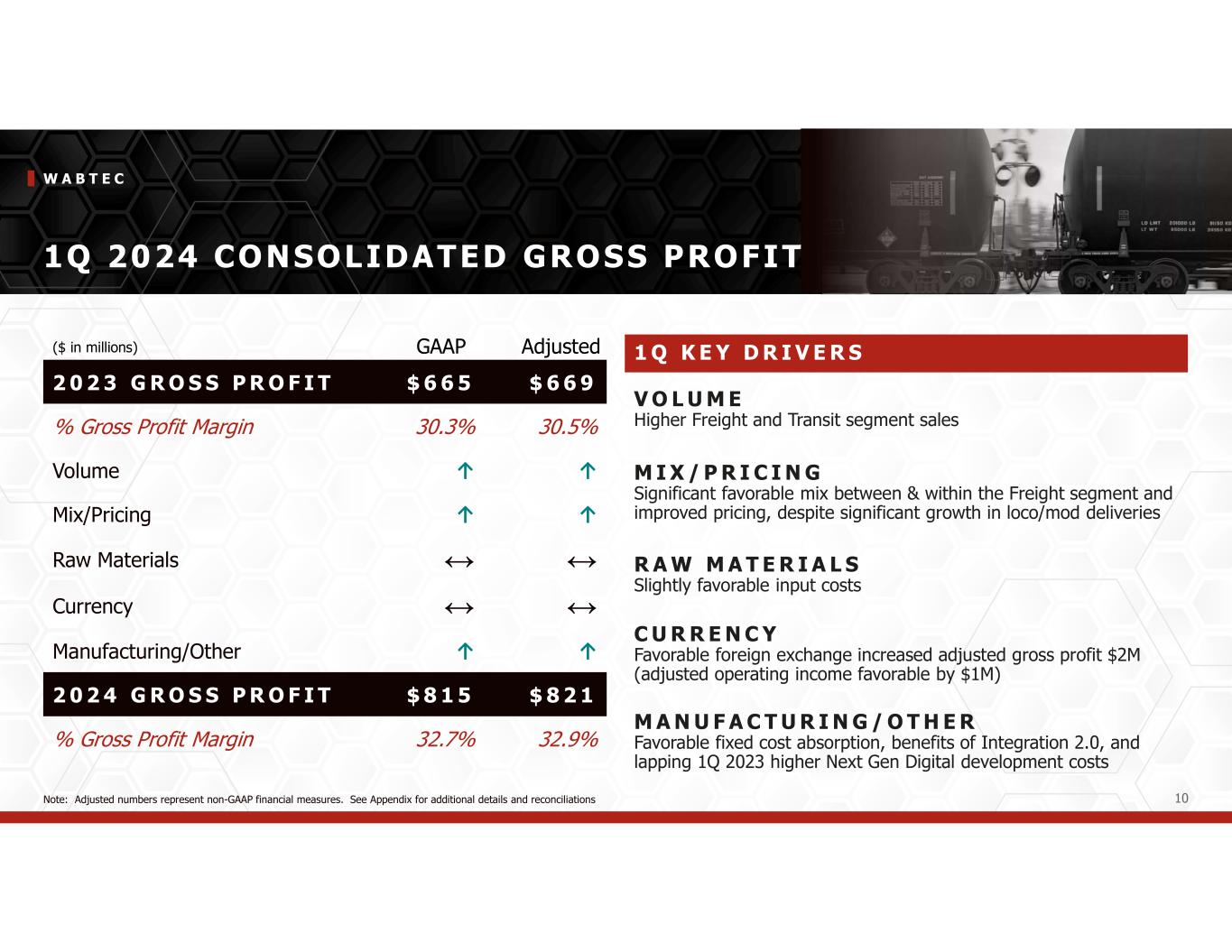 W A B T E C 9 1Q 2024 SALES (in millions) P R O D U C T L I N E 1 Q 2 4 Y O Y Equipment $526 30.2% Components $293 13.6% Digital Intelligence $176 (5.9%) Services $829 17.3% Freight Segment $1,824 17.2% Transit Segment $673 5.5% T O T A L S A L E S $ 2 , 4 9 7 1 3 . 8 % 1 Q K E Y D R I V E R S E Q U I P M E N T Higher mining sales and locomotive deliveries C O M P O N E N T S Increased demand for industrial products, higher international sales and the year-over-year impact of the L&M acquisition, partially offset by a lower North America railcar build (down 0.4% YoY excluding acquisitions) D I G I T A L I N T E L L I G E N C E Lower sales in North America, partially offset by growth in on-board locomotive products and digital mining S E R V I C E S Increased sales from significantly higher mods deliveries, increased overhauls, and higher parts sales T R A N S I T Higher OE and aftermarket sales … sales up 4.9% on constant currency basis