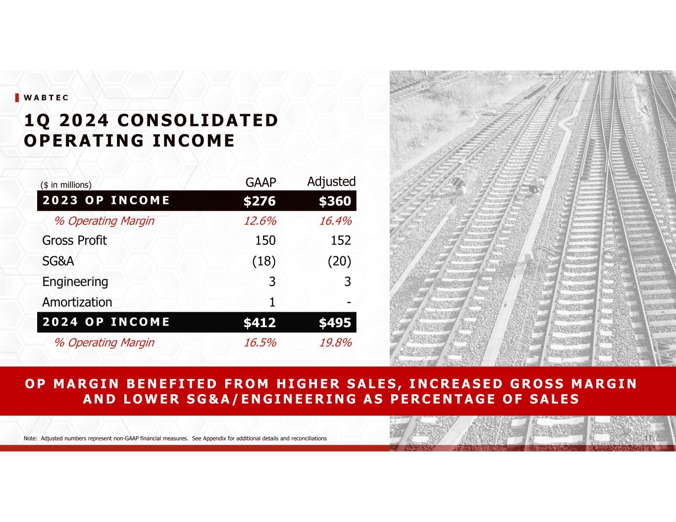 W A B T E C 11 1Q 2024 CONSOLIDATED OPERATING INCOME 2 0 2 3 O P I N C O M E $276 $360 % Operating Margin 12.6% 16.4% Gross Profit 150 152 SG&A (18) (20) Engineering 3 3 Amortization 1 - 2 0 2 4 O P I N C O M E $412 $495 % Operating Margin 16.5% 19.8% O P M A R G I N B E N E F I T E D F R O M H I G H E R S A L E S , I N C R E A S E D G R O S S M A R G I N A N D L O W E R S G & A / E N G I N E E R I N G A S P E R C E N T A G E O F S A L E S Adjusted ($ in millions) GAAP Note: Adjusted numbers represent non-GAAP financial measures. See Appendix for additional details and reconciliations