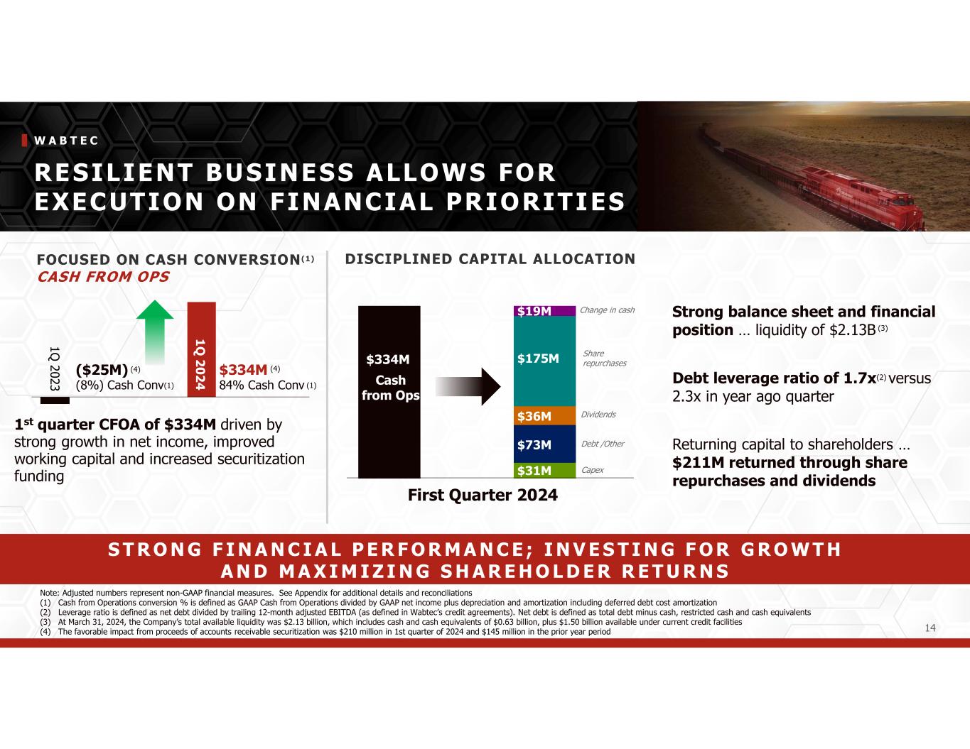 APPENDIX ICASH CONVERSION RECONCILIATION Wabtec Corporation 2024 Q1 YTD Cash Conversion Calculation (in millions) Reported Cash from Operations Consolidated Results $334 $277 $123 84% Wabtec Corporation 2023 Q1 YTD Cash Conversion Calculation (in millions) Reported Cash from Operations Consolidated Results ($25) $173 $123 (8%) ÷ + = Cash Conversion(Net Income Depreciation & Amortization) Set forth below is the calculation of the non-GAAP performance measures included in this press release. We believe that these measures provide useful supplemental information to assess our operating performance and to evaluate period-to-period comparisons. Non-GAAP financial measures should be viewed in addition to, and not as an alternative for, Wabtec's reported results prepared in accordance with GAAP. + = Cash Conversion(Net Income Depreciation & Amortization)