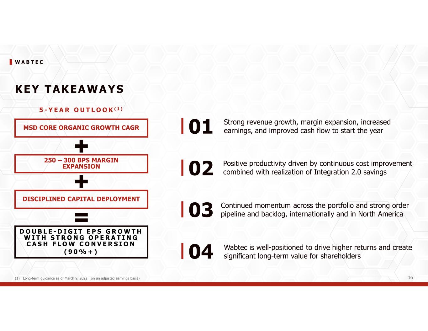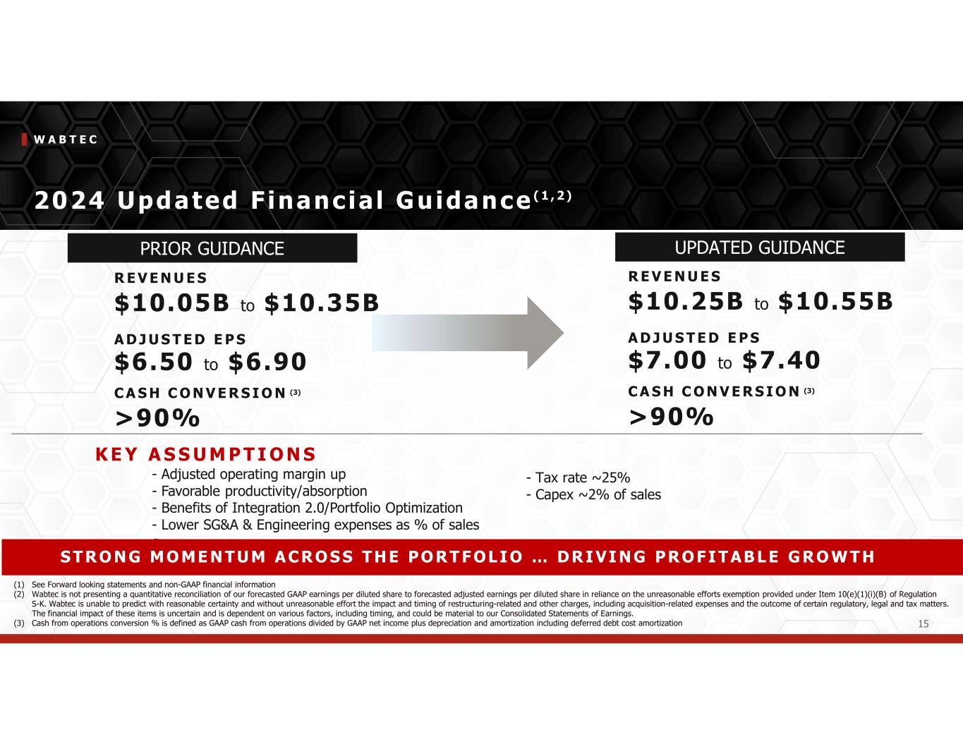 W A B T E C 15 2024 Updated F inanc ial Guidance ( 1 , 2 ) - Adjusted operating margin up - Favorable productivity/absorption - Benefits of Integration 2.0/Portfolio Optimization - Lower SG&A & Engineering expenses as % of sales g K E Y A S S U M P T I O N S - Tax rate ~25% - Capex ~2% of sales R E V E N U E S $10.05B to $10.35B A D J U S T E D E P S $6.50 to $6.90 C A S H C O N V E R S I O N (3) >90% UPDATED GUIDANCEPRIOR GUIDANCE R E V E N U E S $10.25B to $10.55B A D J U S T E D E P S $7.00 to $7.40 C A S H C O N V E R S I O N (3) >90% (1) See Forward looking statements and non-GAAP financial information (2) Wabtec is not presenting a quantitative reconciliation of our forecasted GAAP earnings per diluted share to forecasted adjusted earnings per diluted share in reliance on the unreasonable efforts exemption provided under Item 10(e)(1)(i)(B) of Regulation S-K. Wabtec is unable to predict with reasonable certainty and without unreasonable effort the impact and timing of restructuring-related and other charges, including acquisition-related expenses and the outcome of certain regulatory, legal and tax matters. The financial impact of these items is uncertain and is dependent on various factors, including timing, and could be material to our Consolidated Statements of Earnings. (3) Cash from operations conversion % is defined as GAAP cash from operations divided by GAAP net income plus depreciation and amortization including deferred debt cost amortization S T RO N G M O ME N TUM ACRO S S THE PO RT F OL I O … DRI VI N G PRO FI T ABL E GRO WT H