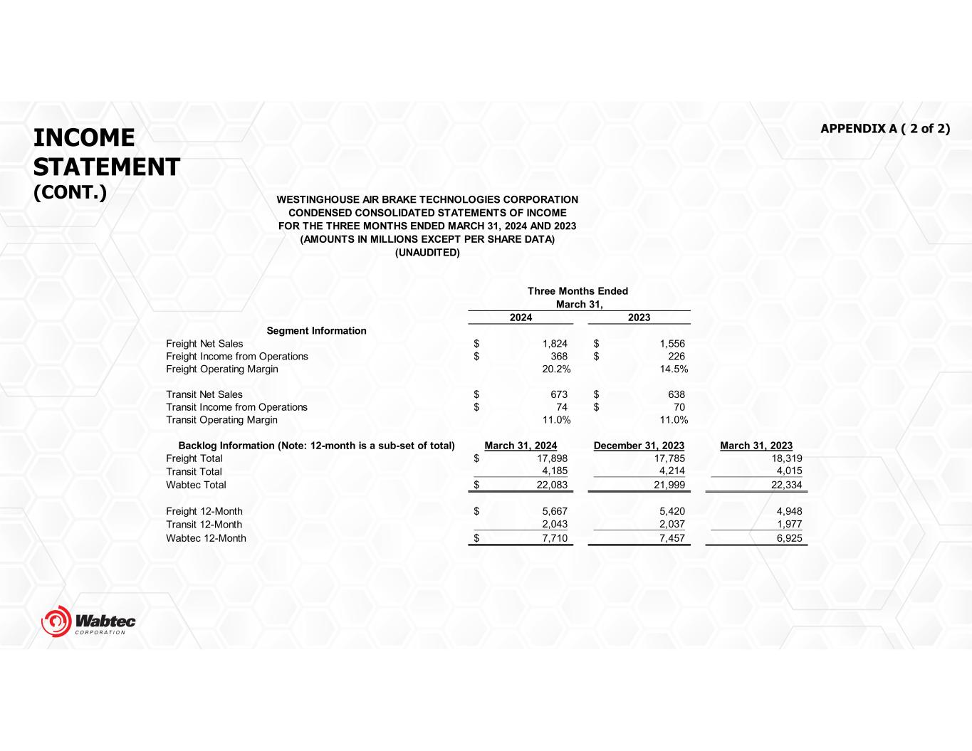 2024 2023 Segment Information Freight Net Sales 1,824$ 1,556$ Freight Income from Operations 368$ 226$ Freight Operating Margin 20.2% 14.5% Transit Net Sales 673$ 638$ Transit Income from Operations 74$ 70$ Transit Operating Margin 11.0% 11.0% Backlog Information (Note: 12-month is a sub-set of total) March 31, 2024 December 31, 2023 March 31, 2023 Freight Total 17,898$ 17,785 18,319 Transit Total 4,185 4,214 4,015 Wabtec Total 22,083$ 21,999 22,334 Freight 12-Month 5,667$ 5,420 4,948 Transit 12-Month 2,043 2,037 1,977 Wabtec 12-Month 7,710$ 7,457 6,925 Three Months Ended March 31, WESTINGHOUSE AIR BRAKE TECHNOLOGIES CORPORATION CONDENSED CONSOLIDATED STATEMENTS OF INCOME FOR THE THREE MONTHS ENDED MARCH 31, 2024 AND 2023 (AMOUNTS IN MILLIONS EXCEPT PER SHARE DATA) (UNAUDITED) INCOME STATEMENT (CONT.) APPENDIX A ( 2 of 2)