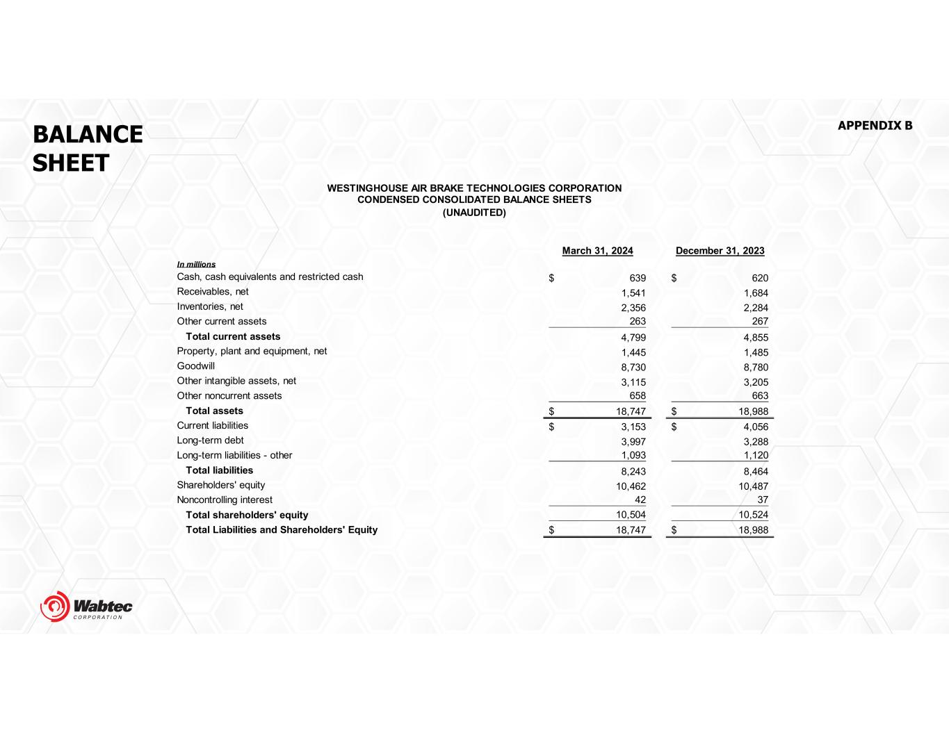 BALANCE SHEET March 31, 2024 December 31, 2023 In millions Cash, cash equivalents and restricted cash 639$ 620$ Receivables, net 1,541 1,684 Inventories, net 2,356 2,284 Other current assets 263 267 Total current assets 4,799 4,855 Property, plant and equipment, net 1,445 1,485 Goodwill 8,730 8,780 Other intangible assets, net 3,115 3,205 Other noncurrent assets 658 663 Total assets 18,747$ 18,988$ Current liabilities 3,153$ 4,056$ Long-term debt 3,997 3,288 Long-term liabilities - other 1,093 1,120 Total liabilities 8,243 8,464 Shareholders' equity 10,462 10,487 Noncontrolling interest 42 37 Total shareholders' equity 10,504 10,524 Total Liabilities and Shareholders' Equity 18,747$ 18,988$ WESTINGHOUSE AIR BRAKE TECHNOLOGIES CORPORATION CONDENSED CONSOLIDATED BALANCE SHEETS (UNAUDITED) APPENDIX B
