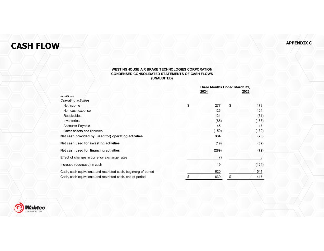 CASH FLOW 2024 2023 In millions Operating activities Net income 277$ 173$ Non-cash expense 126 124 Receivables 121 (51) Inventories (85) (188) Accounts Payable 45 47 Other assets and liabilities (150) (130) Net cash provided by (used for) operating activities 334 (25) Net cash used for investing activities (19) (32) Net cash used for financing activities (289) (72) Effect of changes in currency exchange rates (7) 5 Increase (decrease) in cash 19 (124) Cash, cash equivalents and restricted cash, beginning of period 620 541 Cash, cash equivalents and restricted cash, end of period 639$ 417$ Three Months Ended March 31, WESTINGHOUSE AIR BRAKE TECHNOLOGIES CORPORATION CONDENSED CONSOLIDATED STATEMENTS OF CASH FLOWS (UNAUDITED) APPENDIX C