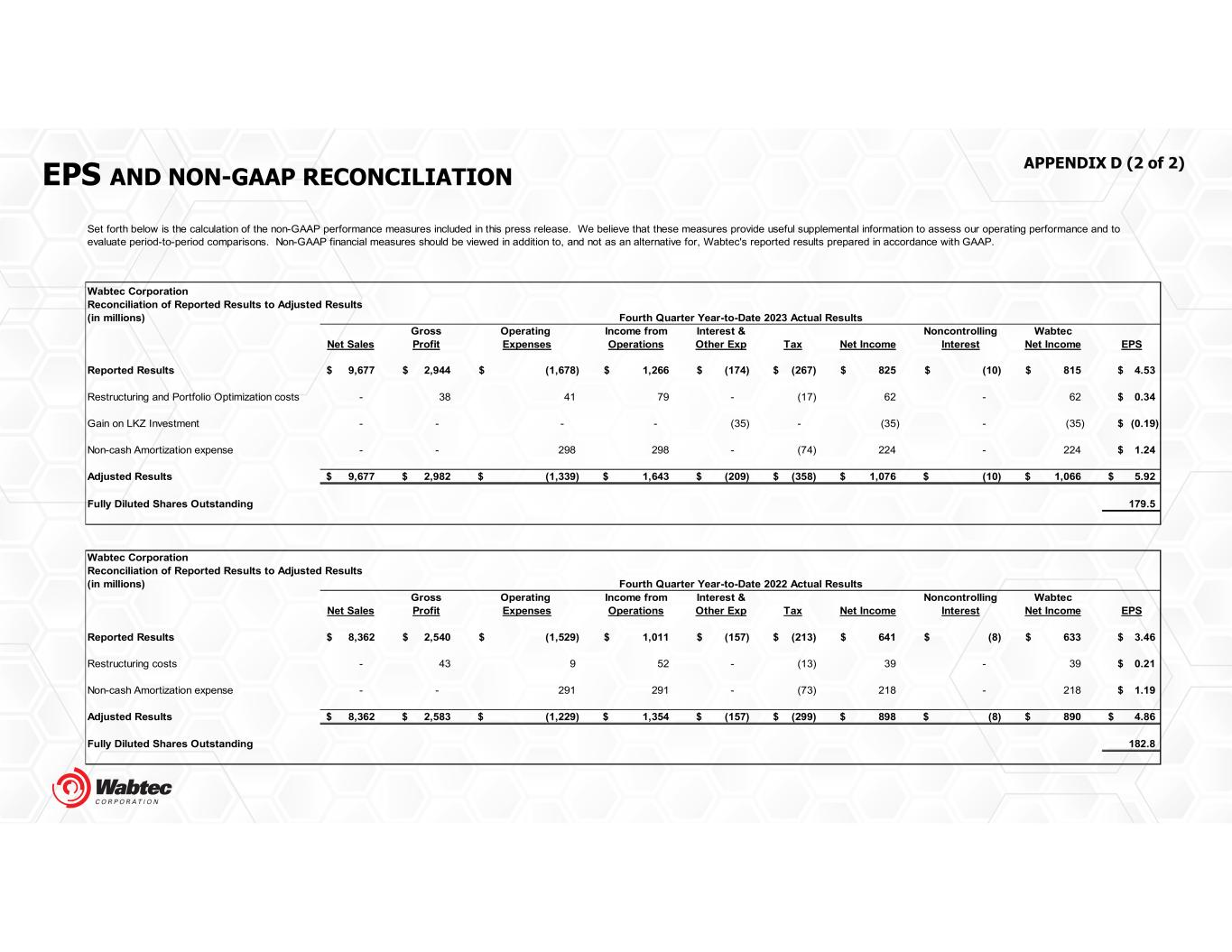 EPS AND NON-GAAP RECONCILIATION APPENDIX D (2 of 2) Wabtec Corporation Reconciliation of Reported Results to Adjusted Results (in millions) Gross Operating Income from Interest & Noncontrolling Wabtec Net Sales Profit Expenses Operations Other Exp Tax Net Income Interest Net Income EPS Reported Results 9,677$ 2,944$ (1,678)$ 1,266$ (174)$ (267)$ 825$ (10)$ 815$ 4.53$ Restructuring and Portfolio Optimization costs - 38 41 79 - (17) 62 - 62 0.34$ Gain on LKZ Investment - - - - (35) - (35) - (35) (0.19)$ Non-cash Amortization expense - - 298 298 - (74) 224 - 224 1.24$ Adjusted Results 9,677$ 2,982$ (1,339)$ 1,643$ (209)$ (358)$ 1,076$ (10)$ 1,066$ 5.92$ Fully Diluted Shares Outstanding 179.5 Wabtec Corporation Reconciliation of Reported Results to Adjusted Results (in millions) Gross Operating Income from Interest & Noncontrolling Wabtec Net Sales Profit Expenses Operations Other Exp Tax Net Income Interest Net Income EPS Reported Results 8,362$ 2,540$ (1,529)$ 1,011$ (157)$ (213)$ 641$ (8)$ 633$ 3.46$ Restructuring costs - 43 9 52 - (13) 39 - 39 0.21$ Non-cash Amortization expense - - 291 291 - (73) 218 - 218 1.19$ Adjusted Results 8,362$ 2,583$ (1,229)$ 1,354$ (157)$ (299)$ 898$ (8)$ 890$ 4.86$ Fully Diluted Shares Outstanding 182.8 Set forth below is the calculation of the non-GAAP performance measures included in this press release. We believe that these measures provide useful supplemental information to assess our operating performance and to evaluate period-to-period comparisons. Non-GAAP financial measures should be viewed in addition to, and not as an alternative for, Wabtec's reported results prepared in accordance with GAAP. Fourth Quarter Year-to-Date 2023 Actual Results Fourth Quarter Year-to-Date 2022 Actual Results