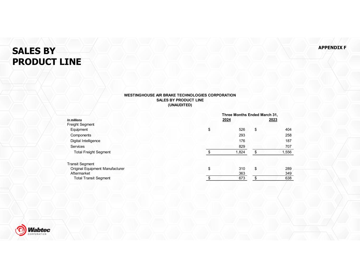 SALES BY PRODUCT LINE In millions 2024 2023 Freight Segment Equipment 526$ 404$ Components 293 258 Digital Intelligence 176 187 Services 829 707 Total Freight Segment 1,824$ 1,556$ Transit Segment Original Equipment Manufacturer 310$ 289$ Aftermarket 363 349 Total Transit Segment 673$ 638$ Three Months Ended March 31, WESTINGHOUSE AIR BRAKE TECHNOLOGIES CORPORATION SALES BY PRODUCT LINE (UNAUDITED) APPENDIX F