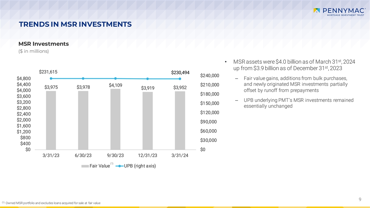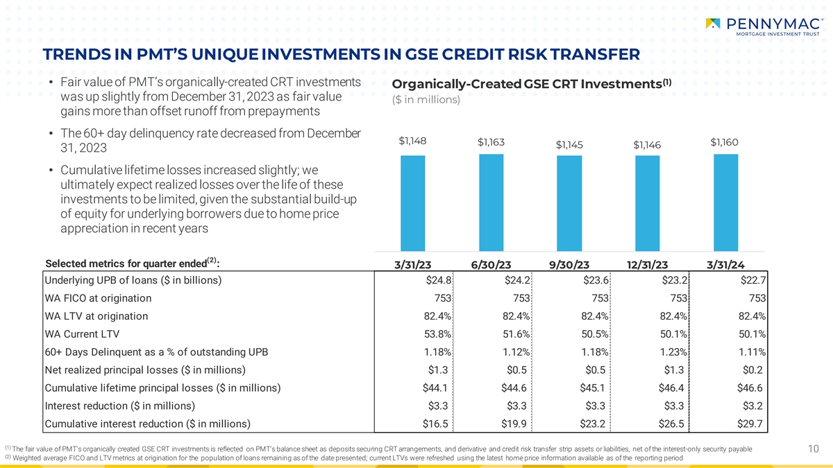 TRENDS IN MSR INVESTMENTS MSR Investments ($ in millions) st • MSR assets were $4.0 billion as of March 31 , 2024 st up from $3.9 billion as of December 31 , 2023 $231,615 $230,494 $240,000 $4,800‒ Fair value gains, additions from bulk purchases, $4,400 and newly originated MSR investments partially $210,000 $4,109 $3,975 $3,978 $3,952 $3,919 $4,000 offset by runoff from prepayments $180,000 $3,600 ‒ UPB underlying PMT’s MSR investments remained $3,200 $150,000 essentially unchanged $2,800 $120,000 $2,400 $2,000 $90,000 $1,600 $60,000 $1,200 $800 $30,000 $400 $0 $0 3/31/23 6/30/23 9/30/23 12/31/23 3/31/24 (1) Fair Value UPB (right axis) 9 (1) Owned MSR portfolio and excludes loans acquired for sale at fair value