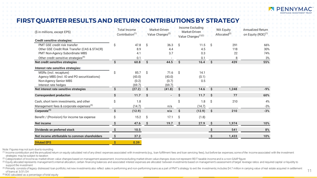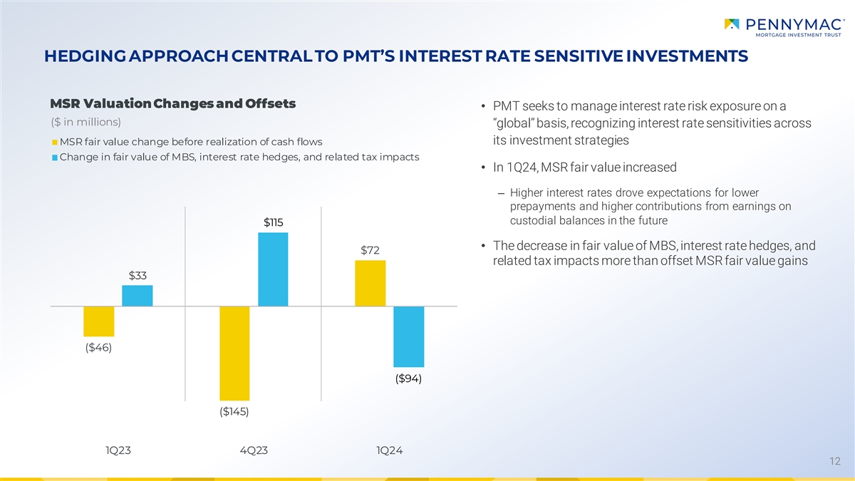 FIRST QUARTER RESULTS AND RETURN CONTRIBUTIONS BY STRATEGY Income Excluding Total Income Market-Driven WA Equity Annualized Return ($ in millions, except EPS) Market-Driven (1) (2) (3) (1) Contribution Value Changes Allocated on Equity (ROE) (1)(2) Value Changes Credit sensitive strategies: PMT GSE credit risk transfer $ 47.8 $ 36.3 $ 11.5 $ 291 66% Other GSE Credit Risk Transfer (CAS & STACR) 8.9 4.4 4.5 118 30% PMT Non-Agency Subordinate MBS 4.1 3.7 0.3 22 74% (4) Other credit sensitive strategies 0.1 - 0.1 8 3% Net credit sensitive strategies $ 60.8 $ 44.5 $ 16.4 $ 439 55% Interest rate sensitive strategies: MSRs (incl. recapture) $ 85.7 $ 71.6 $ 14.1 Agency MBS (incl. IO and PO securitizations) (43.0) (43.0) (0.1) Non-Agency Senior MBS (0.2) (0.7) 0.5 Interest rate hedges (69.7) (69.7) Net interest rate sensitive strategies $ (27.2) $ (41.8) $ 14.6 $ 1,248 -9% Correspondent production $ 11.7 $ - $ 11.7 $ 77 60% Cash, short term investments, and other $ 1.8 $ 1.8 $ 210 4% (5) Management fees & corporate expenses (14.7) n/a (14.7) -3% (5) Corporate $ (12.9) n/a $ (12.9) $ 210 -3% Benefit / (Provision) for income tax expense $ 15.2 $ 17.1 $ (1.8) Net income $ 47.6 $ 19.7 $ 27.9 $ 1,974 10% Dividends on preferred stock $ 10.5 $ 541 8% Net income attributable to common shareholders $ 37.2 $ 1,433 10% Diluted EPS $ 0.39 Note: Figures may not sum due to rounding (1) Income contribution and the annualized return on equity calculated net of any direct expenses associated with investments (e.g., loan fulfillment fees and loan servicing fees), but before tax expenses; some of the income associated with the investment strategies may be subject to taxation (2) Categorization of income as market-driven value changes based on management assessment; income excluding market-driven value changes does not represent REIT taxable income and is a non-GAAP figure (3) Equity allocated represents management’s internal allocation; certain financing balances and associated interest expenses are allocated between investments based on management’s assessment of target leverage ratios and required capital or liquidity to support the investment (4) Primarily consists of legacy distressed loan portfolio; net new investments also reflect sales in performing and non-performing loans as a part of PMT’s strategy to exit the investments; includes $4.7 million in carrying value of real estate acquired in settlement 11 of loans at 3/31/24 (5) ROE calculated as a percentage of total equity