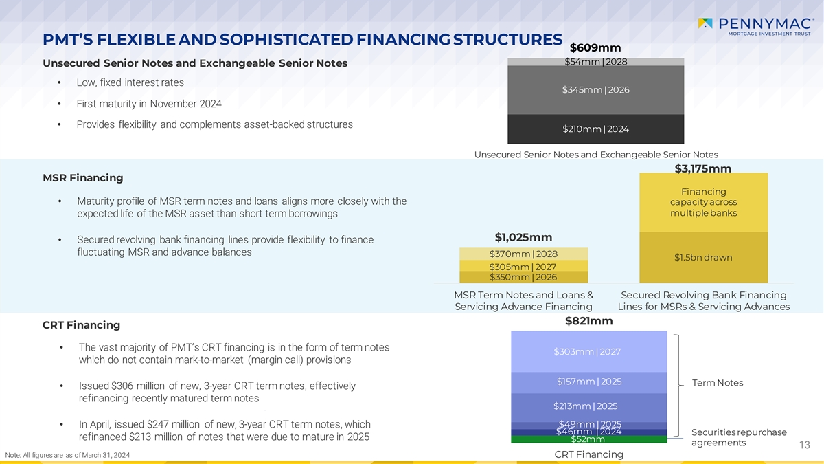 HEDGING APPROACH CENTRAL TO PMT’S INTEREST RATE SENSITIVE INVESTMENTS MSR Valuation Changes and Offsets • PMT seeks to manage interest rate risk exposure on a ($ in millions) “global” basis, recognizing interest rate sensitivities across its investment strategies MSR fair value change before realization of cash flows Change in fair value of MBS, interest rate hedges, and related tax impacts • In 1Q24, MSR fair value increased ‒ Higher interest rates drove expectations for lower prepayments and higher contributions from earnings on custodial balances in the future $115 • The decrease in fair value of MBS, interest rate hedges, and $72 related tax impacts more than offset MSR fair value gains $33 ($46) ($94) ($145) 1Q23 4Q23 1Q24 12