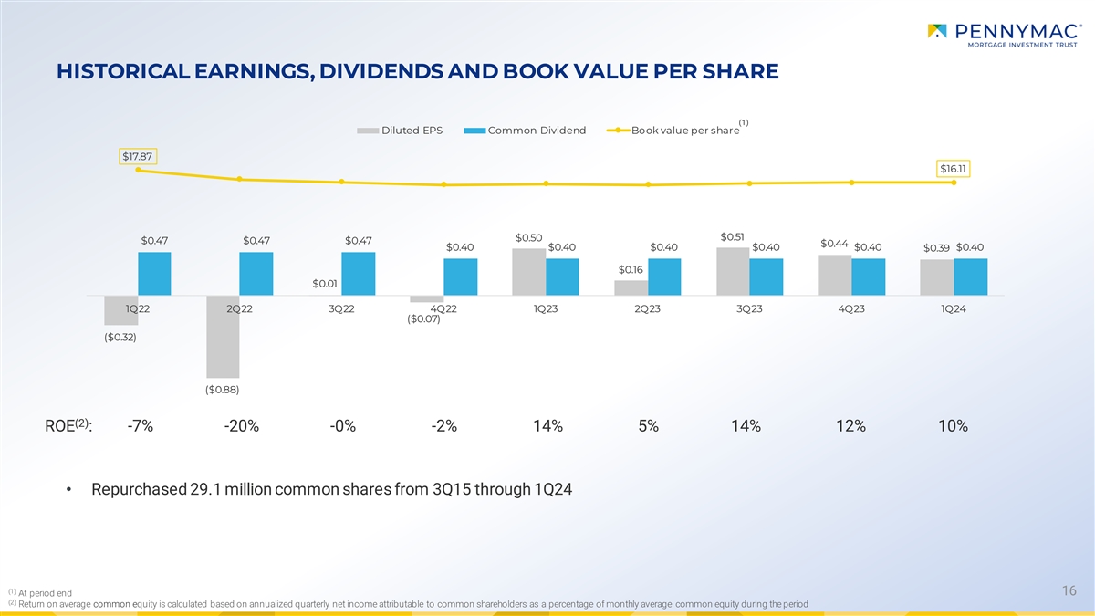 PMT IS FOCUSED ON UNIQUE INVESTMENT STRATEGIES IN THREE SEGMENTS • Leading acquirer and producer of conventional conforming mortgage loans • Significant growth in market share over PMT’s more than 14-year history driven by PFSI’s Correspondent operational excellence and high service levels Production • Provides unique ability to produce investment assets organically • MSR investments created through the securitization of conventional correspondent loan production Interest Rate Sensitive • Hedged with Agency MBS and interest rate derivatives Strategies • Strong track record and discipline in hedging interest rate risk • Investments in credit risk on PMT’s high-quality loan production with ability to influence performance through active servicing supplemented by opportunistic investments in CRT bonds Credit issued by the GSEs Sensitive Strategies • Approximately $22.7 billion in UPB of loans underlying PMT’s front-end GSE CRT investments at March 31, 2024 15