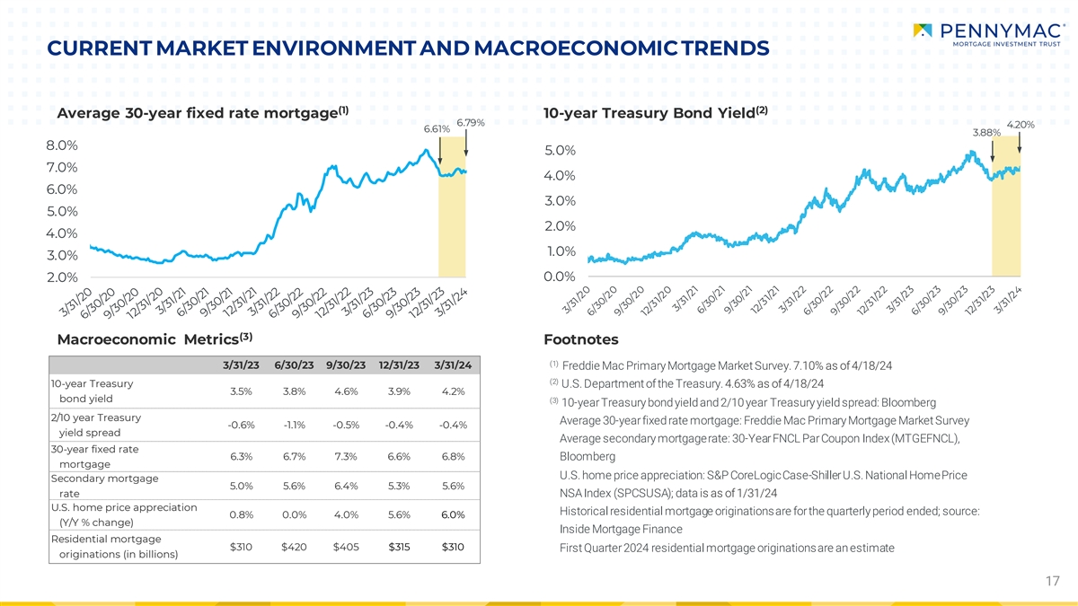 CURRENT MARKET ENVIRONMENT AND MACROECONOMIC TRENDS (1) (2) Average 30-year fixed rate mortgage 10-year Treasury Bond Yield 6.79% 4.20% 6.61% 3.88% 8.0% 5.0% 7.0% 4.0% 6.0% 3.0% 5.0% 2.0% 4.0% 1.0% 3.0% 2.0% 0.0% (3) Macroeconomic Metrics Footnotes (1) 3/31/23 6/30/23 9/30/23 12/31/23 3/31/24 Freddie Mac Primary Mortgage Market Survey. 7.10% as of 4/18/24 (2) 10-year Treasury U.S. Department of the Treasury. 4.63% as of 4/18/24 3.5% 3.8% 4.6% 3.9% 4.2% bond yield (3) 10-year Treasury bond yield and 2/10 year Treasury yield spread: Bloomberg 2/10 year Treasury Average 30-year fixed rate mortgage: Freddie Mac Primary Mortgage Market Survey -0.6% -1.1% -0.5% -0.4% -0.4% yield spread Average secondary mortgage rate: 30-Year FNCL Par Coupon Index (MTGEFNCL), 30-year fixed rate 6.3% 6.7% 7.3% 6.6% 6.8% Bloomberg mortgage U.S. home price appreciation: S&P CoreLogic Case-Shiller U.S. National Home Price Secondary mortgage 5.0% 5.6% 6.4% 5.3% 5.6% rate NSA Index (SPCSUSA); data is as of 1/31/24 U.S. home price appreciation Historical residential mortgage originations are for the quarterly period ended; source: 0.8% 0.0% 4.0% 5.6% 6.0% (Y/Y % change) Inside Mortgage Finance Residential mortgage $310 $420 $405 $315 $310 First Quarter 2024 residential mortgage originations are an estimate originations (in billions) 17